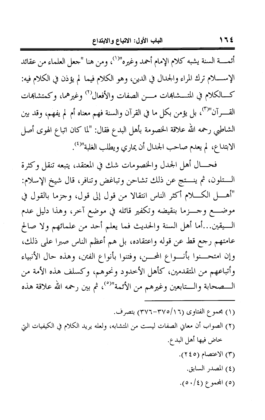 أئمة السنة يشبه كلام الإمام أحمد وغيره" (¬١)، ومن هنا "جعل العلماء من عقائد الإسلام ترك المراء والجدال في الدين، وهو الكلام فيما لم يؤذن في الكلام فيه: كالكلام في المتشابهات من الصفات والأفعال (¬٢) وغيرهما، وكمتشابهات القرآن" (¬٣)، بل يؤمن بكل ما في القرآن والسنة فهم معناه أم لم يفهم، وقد بين الشاطبي رحمه اللَّه علاقة الخصومة بأهل البدع فقال: "لما كان اتباع الهوى أصل الابتداع، لم يعدم صاحب الجدال أن يماري ويطلب الغلبة" (¬٤).