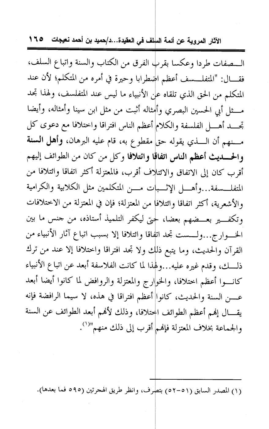 الصفات طردا وعكسا بقرب الفرق من الكتاب والسنة واتباع السلف، فقال: "المتفلسف أعظم اضطرابا وحيرة في أمره من المتكلم؛ لأن عند المتكلم من الحق الذي تلقاه عن الأنبياء ما ليس عند المتفلسف، ولهذا تجد مثل أبي الحسين البصري وأمثاله أثبت من مثل ابن سينا وأمثاله، وأيضا تجد أهل الفلسفة والكلام أعظم الناس افتراقا واختلافا مع دعوى كل منهم أن الذي يقوله حق مقطوع به، قام عليه البرهان، وأهل السنة والحديث أعظم الناس اتفاقا وائتلافا وكل من كان من الطوائف إليهم أقرب كان إلى الاتفاق والائتلاف أقرب، فالمعتزلة أكثر اتفاقا وائتلافا من المتفلسفة. . . وأهل الإثبات من المتكلمين مثل الكلابية والكرامية والأشعرية، أكثر اتفاقا وائتلافا من المعتزلة؛ فإن في المعتزلة من الاختلافات وتكفير بعضهم بعضا، حتى ليكفر التلميذ أستاذه، من جنس ما بين الخوارج. . . ولست تجد اتفاقا وائتلافا إلا بسبب اتباع آثار الأنبياء من القرآن والحديث، وما يتبع ذلك ولا تجد افتراقا واختلافا إلا عند من ترك ذلك، وقدم غيره عليه. . . ولهذا لما كانت الفلاسفة أبعد عن اتباع الأنبياء كانوا أعظم اختلافا، والخوارج والمعتزلة والروافض لما كانوا أيضا أبعد عن السنة والحديث، كانوا أعظم افتراقا في هذه، لا سيما الرافضة فإنه يقال إنهم أعظم الطوائف اختلافا، وذلك لأنهم أبعد الطوائف عن السنة والجماعة بخلاف المعتزلة فإنهم أقرب إلى ذلك منهم" (¬١).