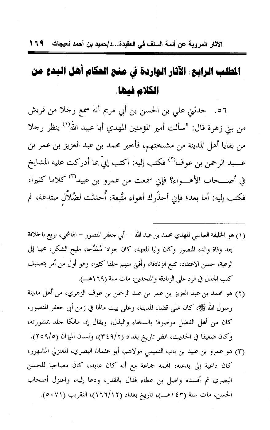 ٥٦ - حدثني علي بن الحسن بن أبي مريم أنه سمع رجلا من قريش من بني زهرة قال: "سألت أمير المؤمنين المهدي أبا عبيد اللَّه (¬١) ينظر رجلا من بقايا أهل المدينة من مشيختهم، فأخبر محمد بن عبد العزيز بن عمر بن عبد الرحمن بن عوف (¬٢) فكتب إليه: اكتب إليّ بما أدركت عليه المشايخ في أصحاب الأهواء؟ فإني سمعت من عمرو بن عبيد (¬٣) كلاما كثيرا، فكتب إليه: أما بعد؛ فإني أحذّرك أهواء متَّبعة، أُحدثت لضُلَّالٍ مبتدعة، لم