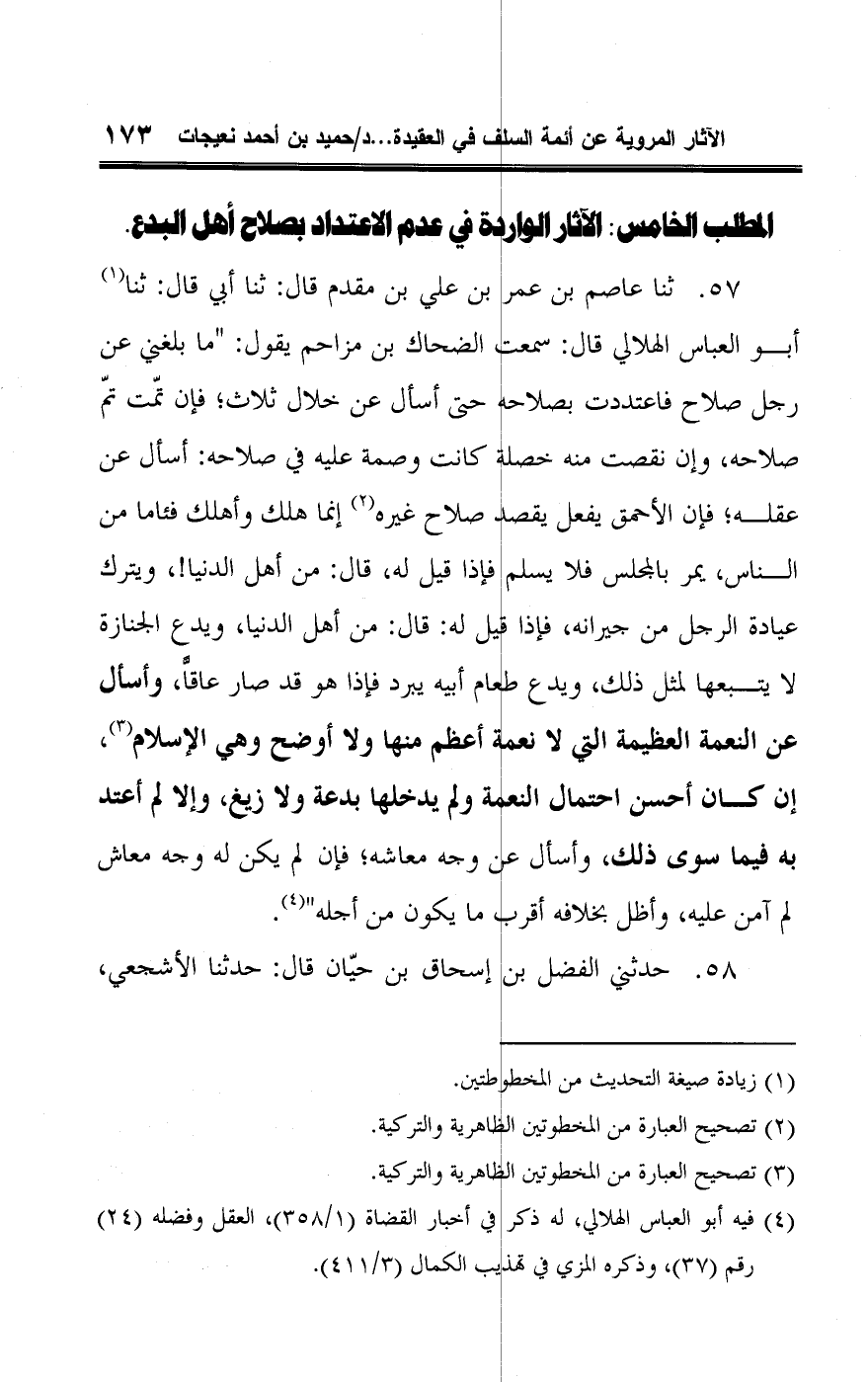 ٥٧ - ثنا عاصم بن عمر بن علي بن مقدم قال: ثنا أبي قال: ثنا (¬١) أبو العباس الهلالي قال: سمعت الضحاك بن مزاحم يقول: "ما بلغني عن رجل صلاح فاعتددت بصلاحه حتى أسأل عن خلال ثلاث؛ فإن تمّت تمّ صلاحه، وإن نقصت منه خصله كانت وصمة عليه في صلاحه: أسأل عن عقله؛ فإن الأحمق يفعل يقصد صلاح غيره (¬٢) إنما هلك وأهلك فئاما من الناس، يمر بالمجلس فلا يسلم فإذا قيل له، قال: من أهل الدنيا! ، ويترك عيادة الرجل من جيرانه، فإذا قيل له: قال: من أهل الدنيا، ويدع الجنازة لا يتبعها لمثل ذلك، ويدع أم أبيه يبرد فإذا هو قد صار عاقًّا، وأسأل عن النعمة العظيمة التي لا نعمه أعظم منها ولا أوضح وهي الإسلام (¬٣)، إن كان أحسن احتمال النعمة ولم يدخلها بدعة ولا زيغ، وإلا لم أعتد به فيما سوى ذلك، وأسأل عن وجه معاشه؛ فإن لم يكن له وجه معاش لم آمن عليه، وأظل بخلافه أقرب ما يكون من أجله" (¬٤).
