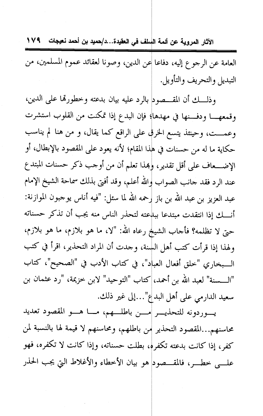 وذلك أن المقصود بالرد عليه بيان بدعته وخطورتها على الدين، وقمعها ودفنها في مهدها؛ فإن البدع إذا تمكنت من القلوب استشرت وعمت، وحينئذ يتسع الخرق على الراقع كما يقال، ومن هنا لم يناسب حكاية ما له من حسنات في هذا المقام؛ لأنه يعود على المقصود بالإبطال، أو الإضعاف على أقل تقدير، وبهذا تعلم أن من أوجب ذكر حسنات المبتدع عند الرد فقد جانب الصواب واللَّه أعلم، وقد أفتى بذلك سماحة الشيخ الإمام عبد العزيز بن عبد اللَّه بن باز رحمه اللَّه لما سئل: "فيه أناس يوجبون الموازنة: أنك إذا انتقدت مبتدعا ببدعته لتحذر الناس منه يجب أن تذكر حسناته حتى لا تظلمه؟ فأجاب الشيخ رعاه اللَّه: "لا، ما هو بلازم، ما هو بلازم، ولهذا إذا قرأت كتب أهل السنة، وجدت أن المراد التحذير، اقرأ في كتب البخاري "خلق أفعال العباد"، في كتاب الأدب في "الصحيح"، كتاب "السنة" لعبد اللَّه بن أحمد، كتاب "التوحيد" لابن خزيمة، "رد عثمان بن سعيد الدارمي على أهل البدع". . . إلى غير ذلك.