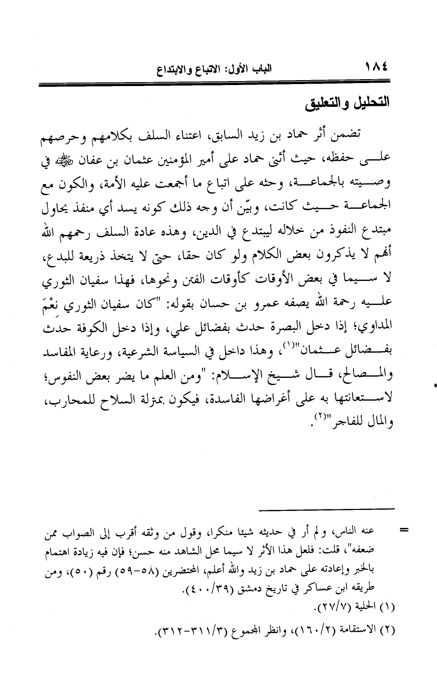 تضمن أثر حماد بن زيد السابق، اعتناء السلف بكلامهم وحرصهم على حفظه، حيث أثنى حماد على أمير المؤمنين عثمان بن عفان -رضي اللَّه عنه- في وصيته بالجماعة، وحثه على اتباع ما أجمعت عليه الأمة، والكون مع الجماعة حيث كانت، وبيّن أن وجه ذلك كونه يسد أي منفذ يحاول مبتدع النفوذ من خلاله ليبتدع في الدين، وهذه عادة السلف رحمهم اللَّه أنهم لا يذكرون بعض الكلام ولو كان حقا، حتى لا يتخذ ذريعة للبدع، لا سيما في بعض الأوقات كأوقات الفتن ونحوها، فهذا سفيان الثوري عليه رحمة اللَّه يصفه عمرو بن حسان بقوله: "كان سفيان الثوري نِعْمَ المداوي؛ إذا دخل البصرة حدث بفضائل علي، وإذا دخل الكوفة حدث بفضائل عثمان" (¬١)، وهذا داخل في السياسة الشرعية، ورعاية المفاسد والمصالح، قال شيخ الإسلام: "ومن العلم ما يضر بعض النفوس؛ لاستعانتها به على أغراضها الفاسدة، فيكون بمنزلة السلاح للمحارب، والمال للفاجر" (¬٢).