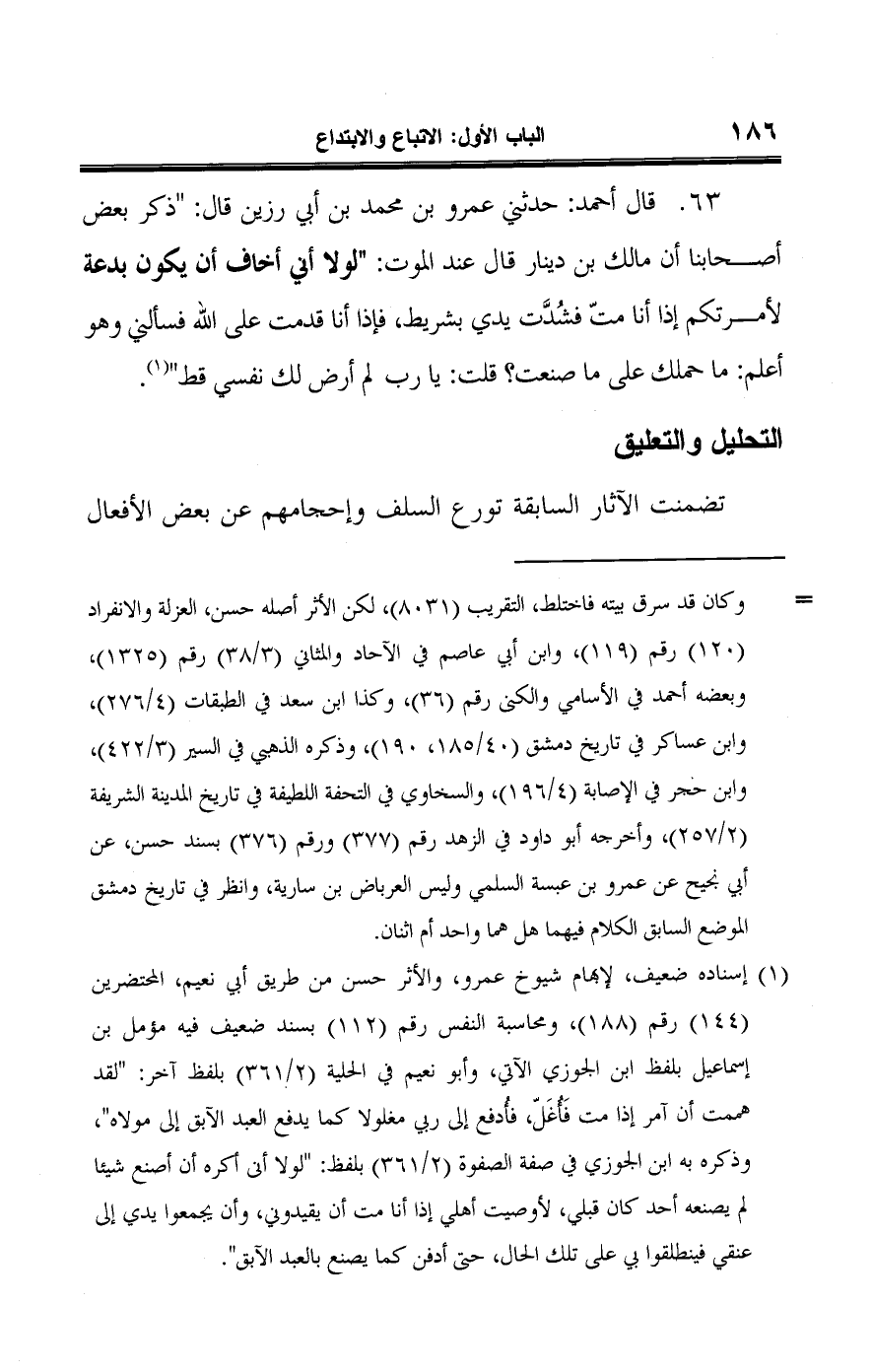 ٦٣ - قال أحمد: حدثني عمرو بن محمد بن أبي رزين قال: "ذكر بعض أصحابنا أن مالك بن دينار قال عند الموت: "لولا أني أخاف أن يكون بدعة لأمرتكم إذا أنا متّ فشُدَّت يدي بشريط، فإذا أنا قدمت على اللَّه فسألني وهو أعلم: ما حملك على ما صنعت؟ قلت: يا رب لم أرض لك نفسى قط" (¬١).