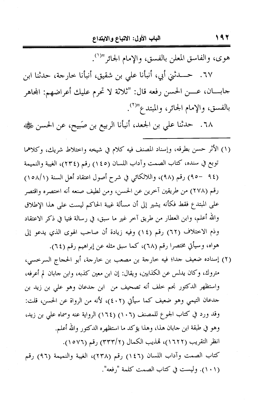 ٦٧ - حدثني أبي، أنبأنا علي بن شقيق، أنبأنا خارجة، حدثنا ابن جابان، عن الحسن رفعه قال: "ثلاثة لا تحرم عليك أعراضهم: المجاهر بالفسق، والإمام الجائر، والمبتدع" (¬٢).