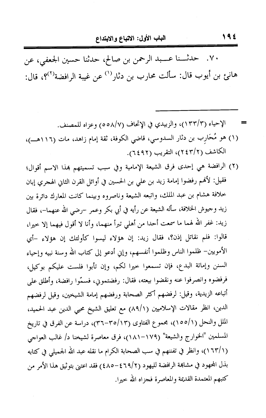 ٧٠ - حدثنا عبد الرحمن بن صالح، حدثنا حسين الجعفي، عن هانئ بن أيوب قال: سألت محارب بن دثار (¬١) عن غيبة الرافضة (¬٢)؟ ، قال: