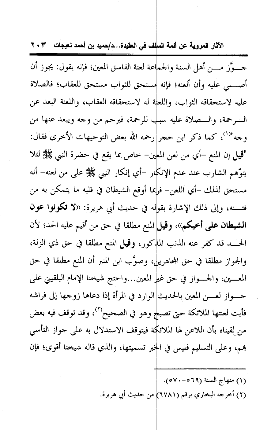 جوَّز من أهل السنة والجماعة لعنة الفاسق المعين؛ فإنه يقول: يجوز أن أصلي عليه وأن ألعنه؛ فإنه مستحق للثواب مستحق للعقاب؛ فالصلاة عليه لاستحقاقه الثواب، واللعنة له لاستحقاقه العقاب، واللعنة البعد عن الرحمة، والصلاة عليه سبب للرحمة، فيرحم من وجه ويبعد عنها من وجه" (¬١)، كما ذكر ابن حجر رحمه اللَّه بعض التوجيهات الأخرى فقال: "قيل إن المنع -أي من لعن المعين- خاص بما يقع في حضرة النبي -صلى اللَّه عليه وسلم- لئلا يتوّهم الشارب عند عدم الإنكار -أي إنكار النبي -صلى اللَّه عليه وسلم- على من لعنه- أنه مستحق لذلك -أي اللعن- فربما أوقع الشيطان في قلبه ما يتمكن به من فتنه، وإلى ذلك الإشارة بقوله في حديث أبي هريرة: "لا تكونوا عون الشيطان على أخيكم"، وقيل المنع مطلقا في حق من أقيم عليه الحد؛ لأن الحد قد كفر عنه الذنب المذكور، وقيل المنع مطلقا في حق ذي الزلة، والجواز مطلقا في حق المجاهرين، وصوَّب ابن المنير أن المنع مطلقا في حق المعين، والجواز في حق غير المعين. . . واحتج شيخنا الإمام البلقيني على جواز لعن المعين بالحديث الوارد في المرأة إذا دعاها زوجها إلى فراشه فأبت لعنتها الملائكة حتى تصبح وهو في الصحيح (¬٢)، وقد توقف فيه بعض من يقيناه بأن اللاعن لها الملائكة فيتوقف الاستدلال به على جواز التأسي بهم، وعلى التسليم فليس في الخبر تسميتها، والذي قاله شيخنا أقوى؛ فإن