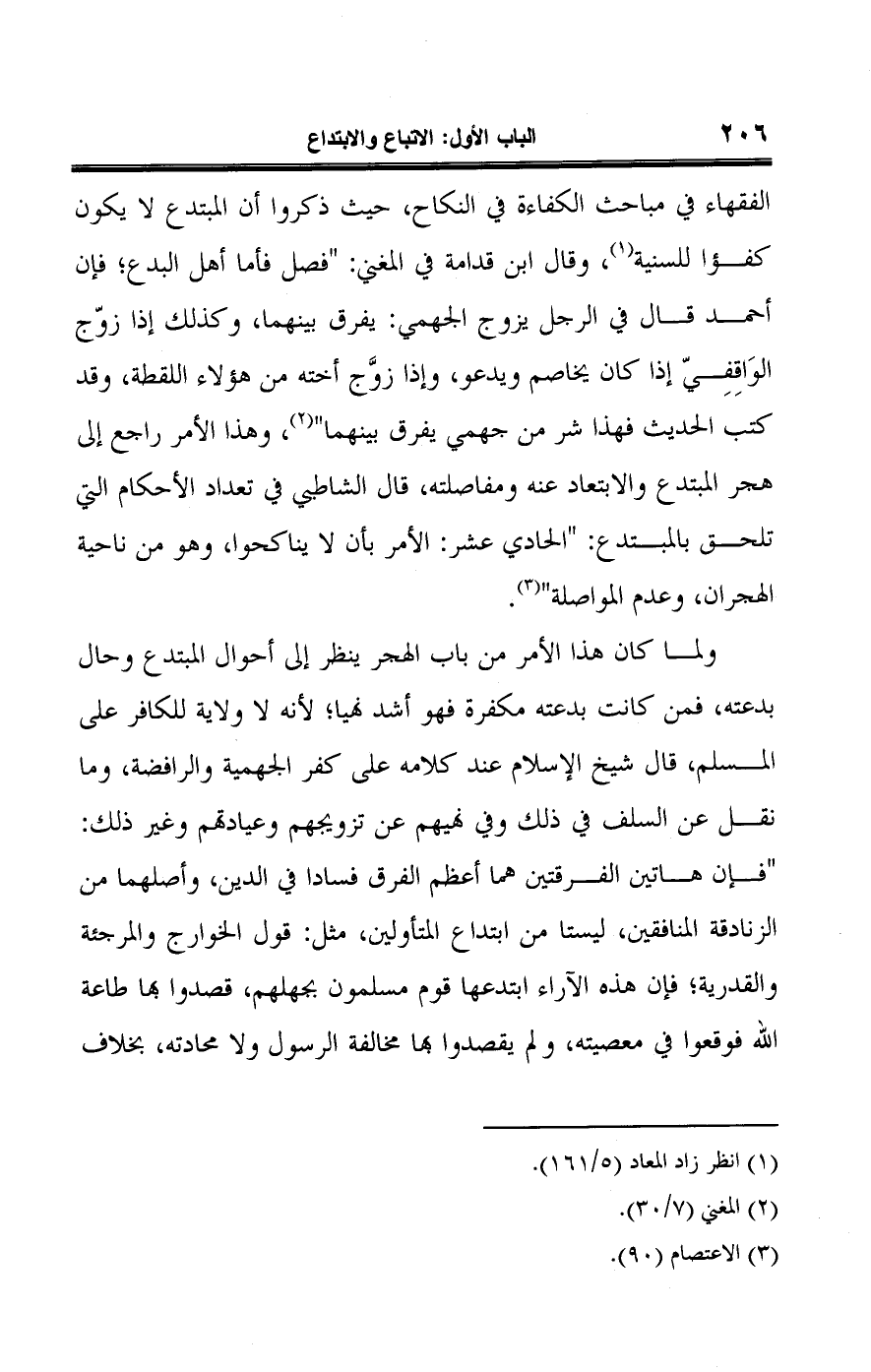 الفقهاء في مباحث الكفاءة في النكاح، حيث ذكروا أن المبتدع لا يكون كفؤا للسنية (¬١)، وقال ابن قدامة في المغني: "فصل فأما أهل البدع؛ فإن أحمد قال في الرجل يزوج الجهمي: يفرق بينهما، وكذلك إذا زوّج الوَاقِفِيّ إذا كان يخاصم ويدعو، وإذا زوَّج أخته من هؤلاء اللقطة، وقد كتب الحديث فهذا شر من جهمي يفرق بينهما" (¬٢)، وهذا الأمر راجع إلى هجر المبتدع والابتعاد عنه ومفاصلته، قال الشاطبي في تعداد الأحكام التي تلحق بالمبتدع: "الحادي عشر: الأمر بأن لا يناكحوا، وهو من ناحية الهجران، وعدم المواصلة" (¬٣).
