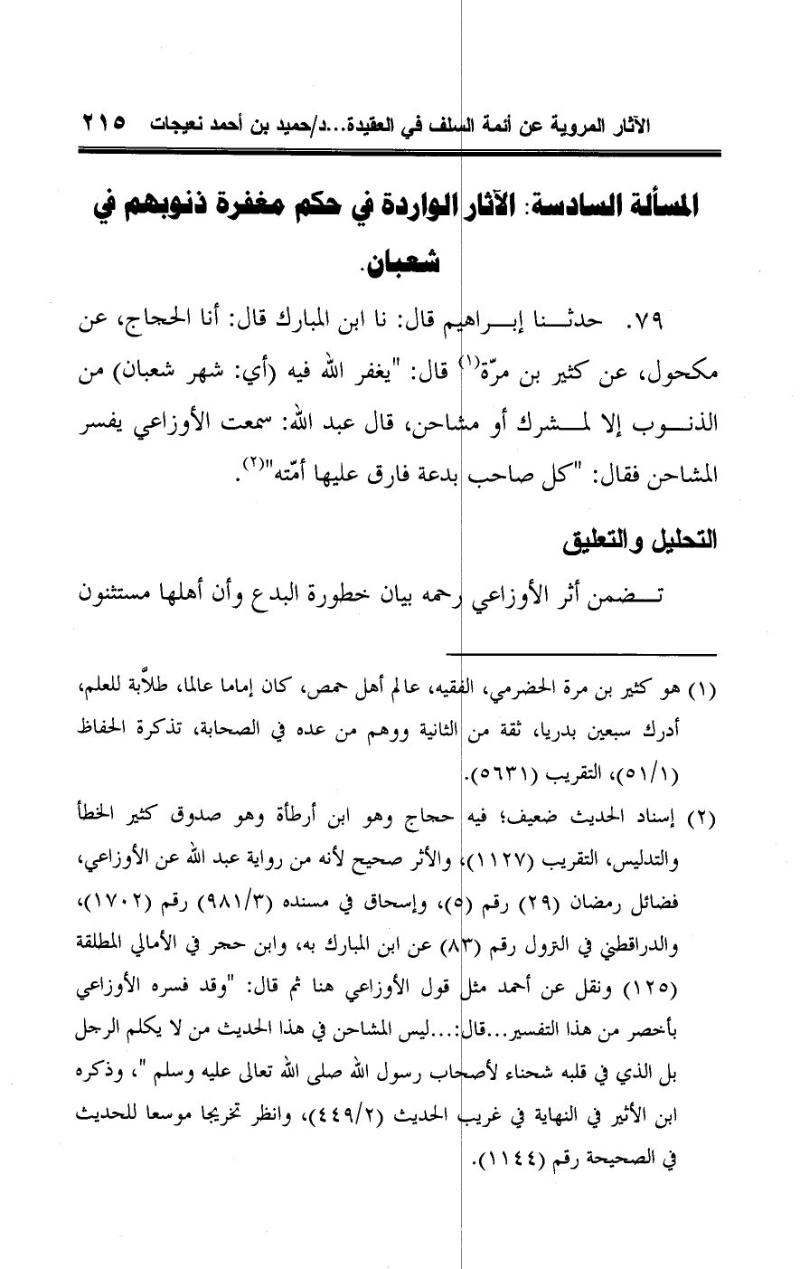 ٧٩ - حدثنا إبراهيم قال: نا ابن المبارك قال: أنا الحجاج، عن مكحول، عن كثير بن مرّة (¬١) قال: "يغفر اللَّه فيه (أي: شهر شعبان) من الذنوب إلا لمشرك أو مشاحن، قال عبد اللَّه: سمعت الأوزاعي يفسر المشاحن فقال: "كل صاحب بدعة فارق عليها أمّته" (¬٢).