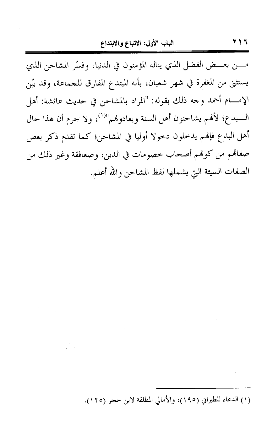من بعض الفضل الذي يناله المؤمنون في الدنيا، وفسّر المشاحن الذي يستثني من المغفرة في شهر شعبان، بأنه المبتدع الفارق للجماعة، وقد بيّن الإمام أحمد وجه ذلك بقوله: "المراد بالمشاحن في حديث عائشة: أهل البدع، لأنهم يشاحنون أهل السنة ويعادونهم" (¬١)، ولا جرم أن هذا حال أهل البدع فإنهم يدخلون دخولا أوليا في المشاحن؛ كما تقدم ذكر بعض صفاتهم من كونهم أصحاب خصومات في الدين، وصعافقة وغير ذلك من الصفات السيئة التي يشملها لفظ المشاحن واللَّه أعلم.