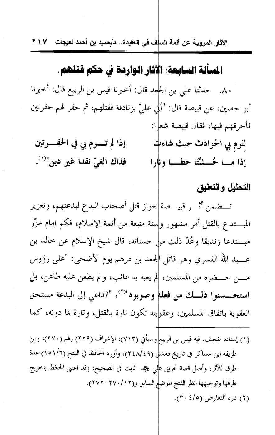 ٨٠ - حدثنا علي بن الجعد قال: أخبرنا قيس بن الربيع قال: أخبرنا أبو حصين، عن قبيصة قال: "أتي عليّ بزنادقة فقتلهم، ثم حفر لهم حفرتين فأحرقهم فيها، فقال قبيصة شعرا: