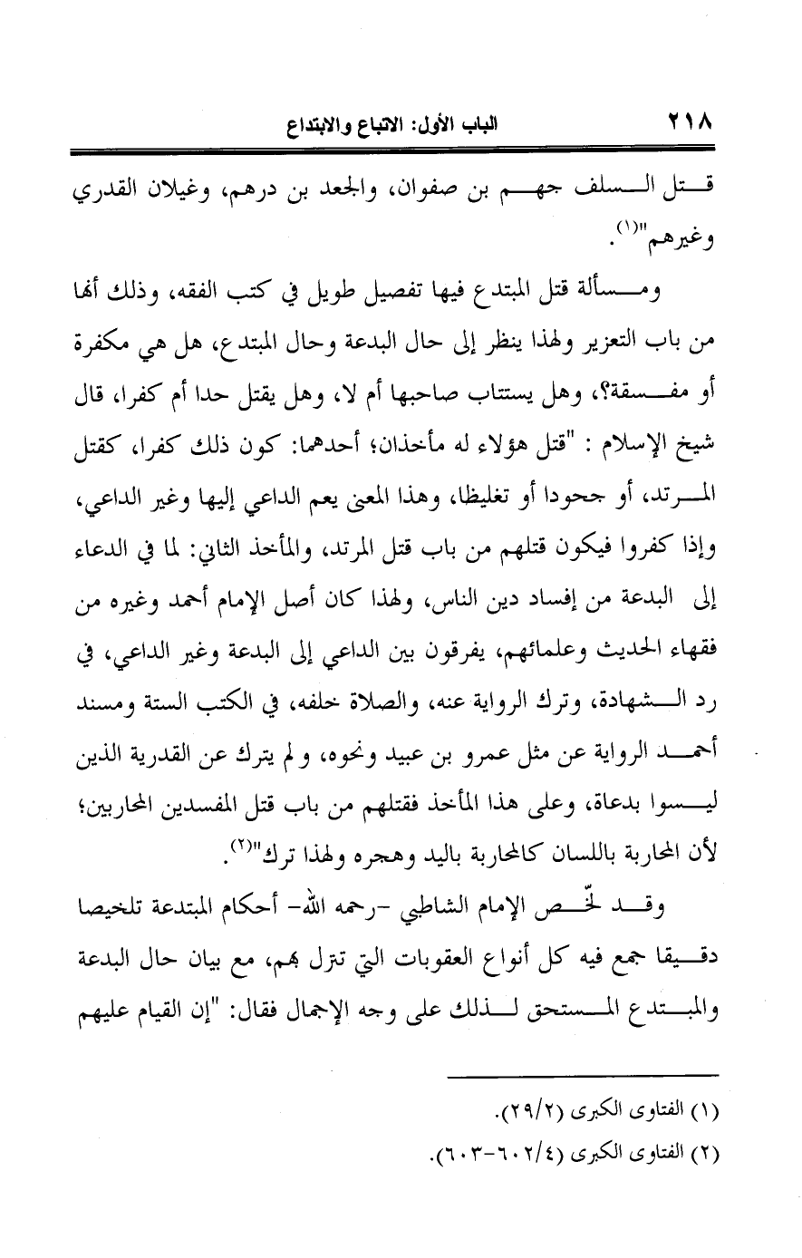 ومسألة قتل المبتدع فيها تفصيل طويل في كتب الفقه، وذلك أنها من باب التعزير ولهذا ينظر إلى حال البدعة وحال المبتدع، هل هي مكفرة أو مفسقة؟ ، وهل يستتاب صاحبها أم لا، وهل يقتل حدا أم كفرا، قال شيخ الإسلام: "قتل هؤلاء له مأخذان؛ أحدهما: كون ذلك كفرا، كقتل المرتد، أو جحودا أو تغليظا، وهذا المعنى يعم الداعي إليها وغير الداعي، وإذا كفروا فيكون قتلهم من باب قتل المرتد، والمأخذ الثاني: لما في الدعاء إلى البدعة من إفساد دين الناس، ولهذا كان أصل الإمام أحمد وغيره من فقهاء الحديث وعلمائهم، يفرقون بين الداعي إلى البدعة وغير الداعي، في رد الشهادة، وترك الرواية عنه، والصلاة خلفه، في الكتب الستة ومسند أحمد الرواية عن مثل عمرو بن عبيد ونحوه، ولم يترك عن القدرية الذين ليسوا بدعاة، وعلى هذا المأخذ فقتلهم من باب قتل المفسدين المحاربين؛ لأن المحاربة باللسان كالمحاربة باليد وهجره ولهذا ترك" (¬٢).