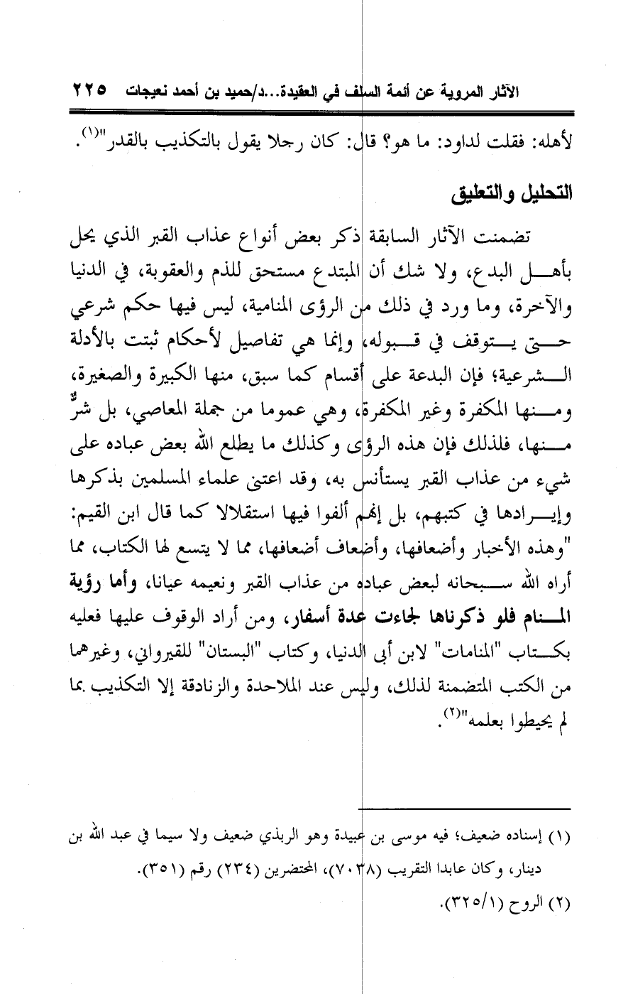تضمنت الآثار السابقة ذكر بعض أنواع عذاب القبر الذي يحل بأهل البدع، ولا شك أن المبتدع مستحق للذم والعقوبة، في الدنيا والآخرة، وما ورد في ذلك من الرؤى المنامية، ليس فيها حكم شرعي حتى يتوقف في قبوله، وإنما هي تفاصيل لأحكام ثبتت بالأدلة الشرعية؛ فإن البدعة على أقسام كما سبق، منها الكبيرة والصغيرة، ومنها المكفرة وغير المكفرة، وهي عموما من جملة المعاصي، بل شرٌّ منها، فلذلك فإن هذه الرؤى وكذلك ما يطلع اللَّه بعض عباده على شيء من عذاب القبر يستأنس به، وقد اعتنى علماء المسلمين بذكرها وإيرادها في كتبهم، بل إنهم ألفوا فيها استقلالا كما قال ابن القيم: "وهذه الأخبار وأضعافها، وأضعاف أضعافها، مما لا يتسع لها الكتاب، مما أراه اللَّه سبحانه لبعض عباده من عذاب القبر ونعيمه عيانا، وأما رؤية المنام فلو ذكرناها لجاءت عدة أسفار، ومن أراد الوقوف عليها فعليه بكتاب "المنامات" لابن أبي الدنيا، وكتاب "البستان" للقيرواني، وغيرهما من الكتب المتضمنة لذلك، وليس عند الملاحدة والزنادقة إلا التكذيب بما لم يحيطوا بعلمه" (¬٢).