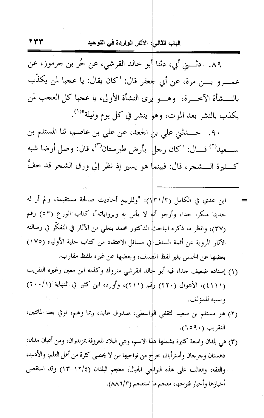 ٨٩ - دثني أبي، دثنا أبو خالد القرشي، عن حُر بن جرموز، عن عمرو بن مرة، عن أبي جعفر قال: "كان يقال: يا عجبا لمن يكذّب بالنشأة الآخرة، وهو يرى النشاة الأولى، يا عجبا كل العجب لمن يكذب بالنشر بعد الموت، وهو ينشر في كل يوم وليلة" (¬١).
