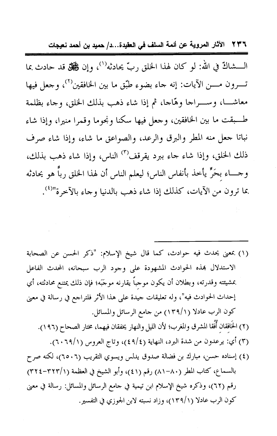(¬١) بمعنى يحدث فيه حوادث، كما قال شيخ الإسلام: "ذكر الحسن عن الصحابة الاستدلال بهذه الحوادث المشهودة على وجود الرب سبحانه، المحدث الفاعل بمشيئته وقدرته، وبطلان أن يكون موجِبًا يقارنه موجَبَه؛ فإن ذلك يمتنع محادثته؛ أي إحداث الحوادث فيه"، وله تعليقات جيدة على هذا الأثر فلتراجع في رسالة في معنى كون الرب عادلا (١/ ١٣٩) من جامع الرسائل والمسائل.