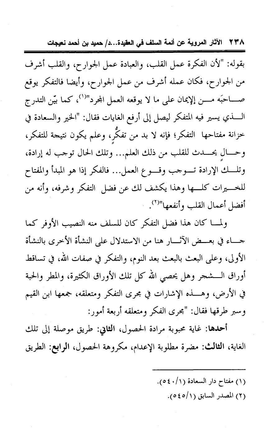 ولما كان هذا فضل التفكر كان للسلف منه النصيب الأوفر كما جاء في بعض الآثار هنا من الاستدلال على النشأة الأخرى بالنشأة الأولى، وعلى البعث بالبعث بعد النوم، والتفكر في صفات اللَّه، في تساقط أوراق الشجر وهل يحصي اللَّه كل تلك الأوراق الكثيرة، والمطر والحبة في الأرض، وهذه الإشارات في مجرى التفكر ومتعلقة، جمعها ابن القيم وسبر طرقها فقال: "مجرى الفكر ومتعلقة أربعة أمور: