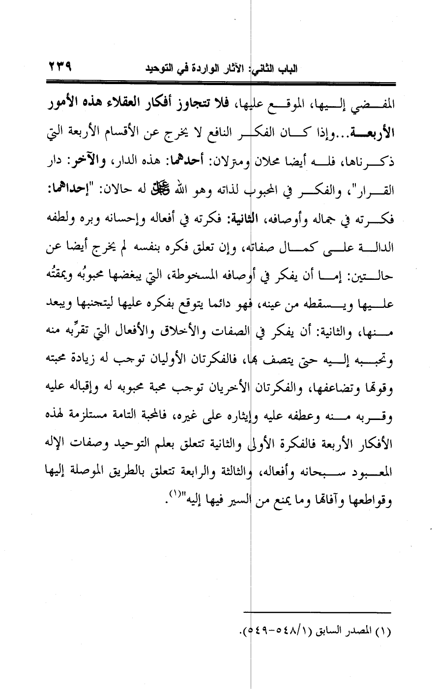 المفضي إليها، الموقع عليها، فلا تتجاوز أفكار العقلاء هذه الأمور الأربعة. . . وإذا كان الفكر النافع لا يخرج عن الأقسام الأربعة التي ذكرناها، فله أيضًا محلان ومنزلان: أحدهما: هذه الدار، والآخر: دار القرار"، والفكر في المحبوب لذاته وهو اللَّه عزَّ وجلَّ له حالان: "إحداهما: فكرته في جماله وأوصافه، الثانية: فكرته في أفعاله وإحسانه وبره ولطفه الدالة على كمال صفاته، وإن تعلق فكره بنفسه لم يخرج أيضًا عن حالتين: إما أن يفكر في أوصافه المسخوطة، التي يبغضها محبوبُه ويمقتُه عليها ويسقطه من عينه، فهو دائما يتوقع بفكره عليها ليتجنبها ويبعد منها، والثانية: أن يفكر في الصفات والأخلاق والأفعال إلى تقرِّبه منه وتحببه إليه حتى يتصف بها، فالفكرتان الأوليان توجب له زيادة محبته وقوتها وتضاعفها، والفكرتان الأخريان توجب محبة محبوبه له وإقباله عليه وقربه منه وعطفه عليه وإيثاره على غيره، فالمحبة التامة مستلزمة لهذه الأفكار الأربعة فالفكرة الأولى والثانية تتعلق بعلم التوحيد وصفات الإله المعبود سبحانه وأفعاله، الثالثة والرابعة تتعلق بالطريق الموصلة إليها وقواطعها وآفاتها وما يمنع من السير فيها إليه" (¬١).
