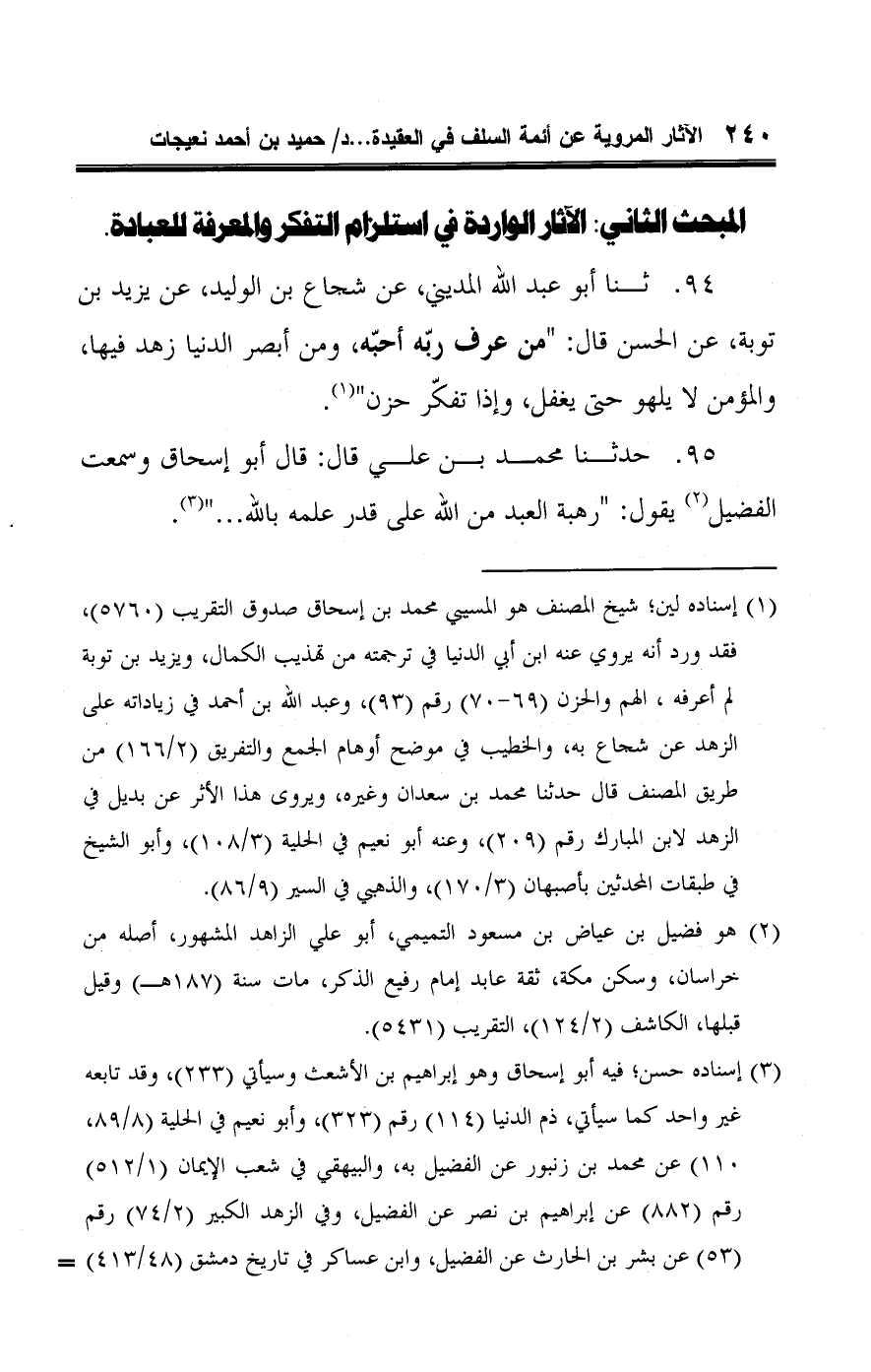 ٩٥ - حدثنا محمد بن علي قال: قال أبو إسحاق وسمعت الفضيل (¬٢) يقول: "رهبة العبد من اللَّه على قدر علمه باللَّه. . ." (¬٣).