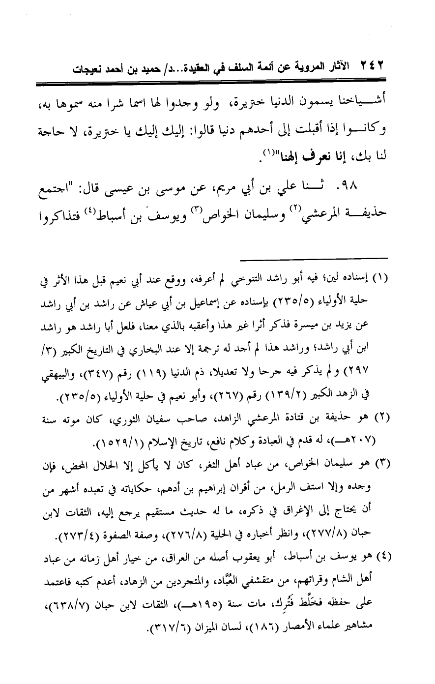 (¬٢) هو حذيفة بن قتادة المرعشي الزاهد، صاحب سفيان الثوري، كان موته سنة (٢٠٧ هـ)، له قدم في العبادة وكلام نافع، تاريخ الإسلام (١/ ١٥٢٩).