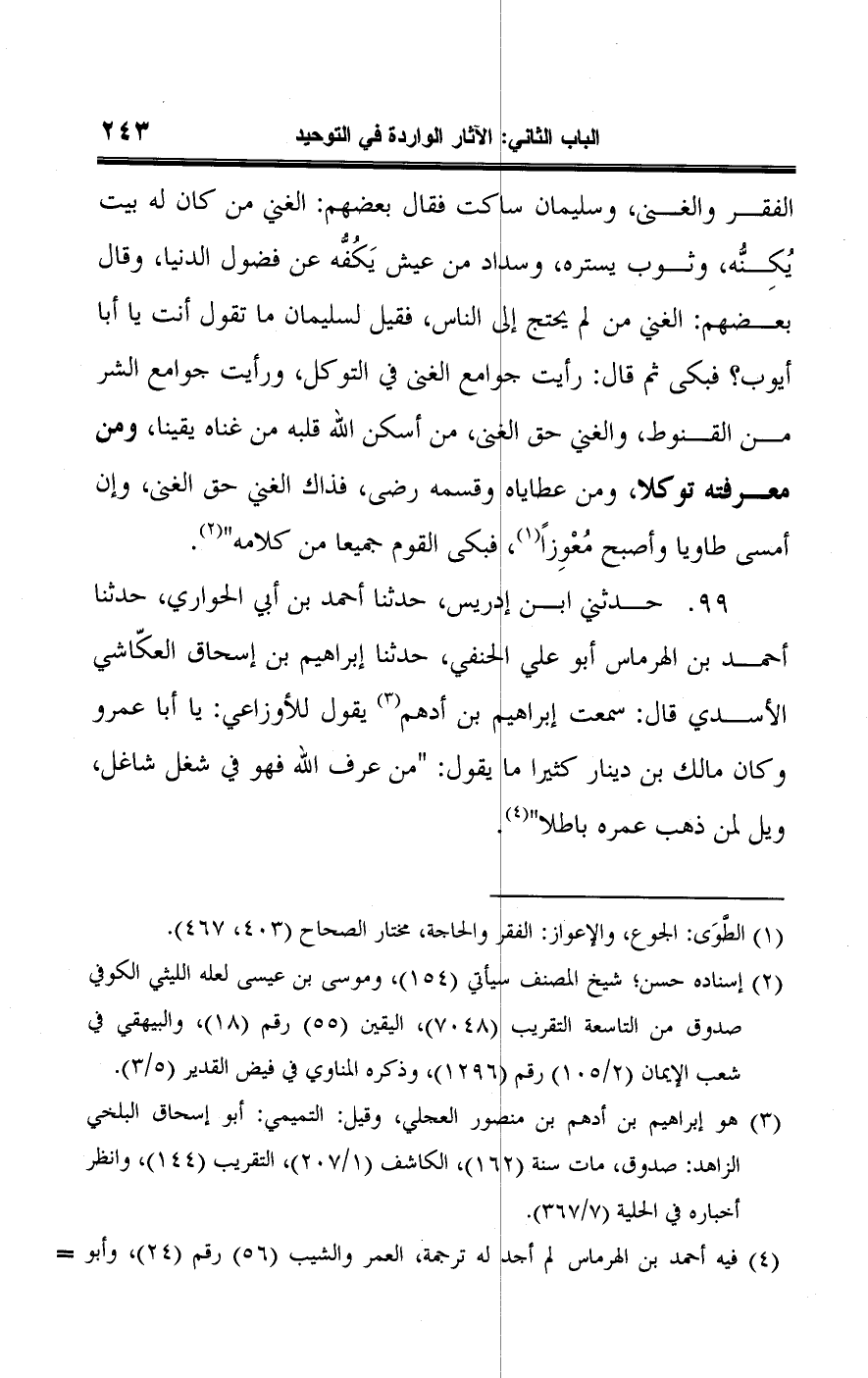 ٩٩ - حدثني ابن إدريس، حدثنا أحمد بن أبي الحواري، حدثنا أحمد بن الهرماس أبو علي الحنفي، حدثنا إبراهيم بن إسحاق العكّاشي الأسدي قال: سمعت إبراهيم بن أدهم (¬٣) يقول للأوزاعي: يا أبا عمرو وكان مالك بن دينار كثيرا ما يقول: "من عرف اللَّه فهو في شغل شاغل، ويل لمن ذهب عمره باطلا" (¬٤)