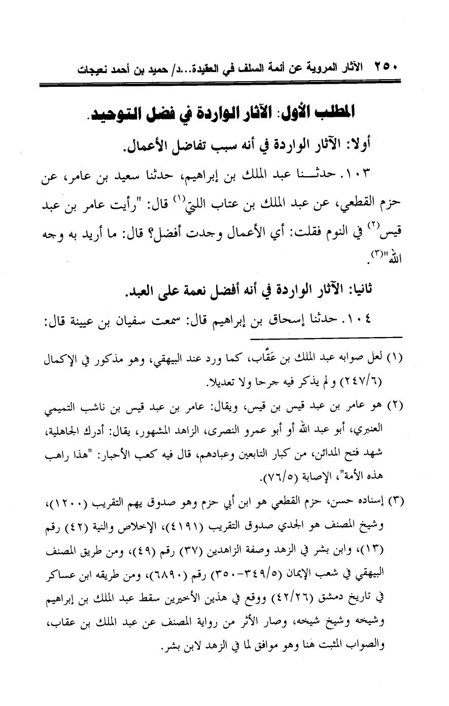 ١٠٣ - حدثنا عبد الملك بن إبراهيم، حدثنا سعيد بن عامر، عن حزم القطعي، عن عبد الملك بن عتاب اللتي (¬١) قال: "رأيت عامر بن عبد قيس (¬٢) في النوم فقلت: أي الأعمال وجدت أفضل؟ قال: ما أريد به وجه اللَّه" (¬٣).