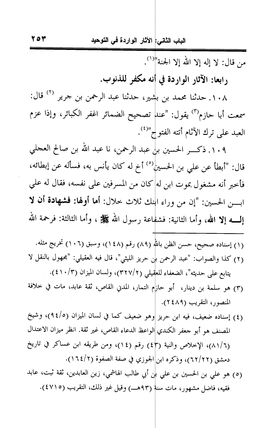 ١٠٩ - ذكر الحسين بن عبد الرحمن، نا عبد اللَّه بن صالح العجلي قال: "أبطأ عن علي بن الحسين (¬٥) أخ له كان يأنس به، فسأله عن إبطائه، فأخبر أنه مشغول بموت ابن له كان من المسرفين على نفسه، فقال له علي ابن الحسين: "إن من وراء ابنك ثلاث خلال: أما أولها: فشهادة أن لا إله إلا اللَّه، وأما الثانية: فشفاعة رسول اللَّه -صلى اللَّه عليه وسلم-، وأما الثالثة: فرحمة اللَّه