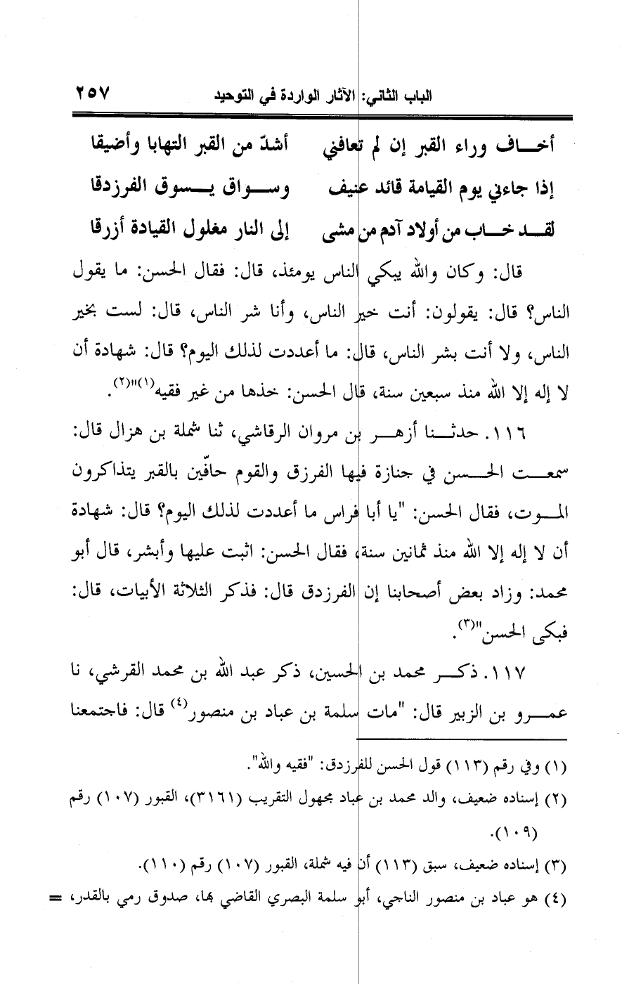 ١١٦ - حدثنا أزهر بن مروان الرقاشي، ثنا شملة بن هزال قال: سمعت الحسن في جنازة فيها الفرزق والقوم حافّين بالقبر يتذاكرون الموت، فقال الحسن: "يا أبا فراس ما أعددت لذلك اليوم؟ قال: شهادة أن لا إله إلا اللَّه منذ ثمانين سنة، فقال الحسن: اثبت عليها وأبشر، قال أبو محمد: وزاد بعض أصحابنا إن الفرزدق قال: فذكر الثلاثة الأبيات، قال: فبكى الحسن" (¬٣).