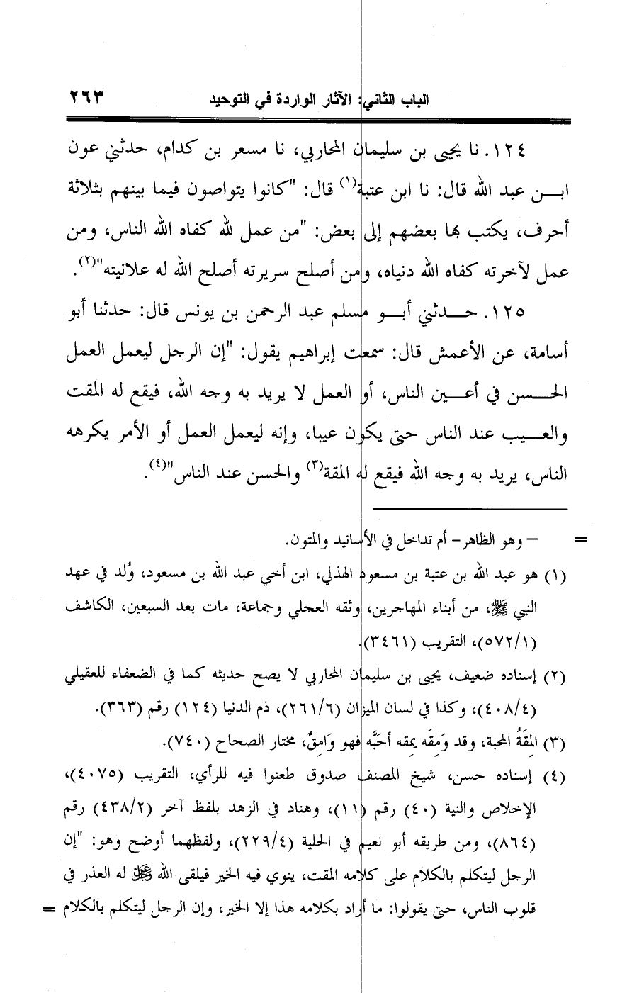 ١٢٤ - نا يحيى بن سليمان المحاربي، نا مسعر بن كدام، حدثني عون ابن عبد اللَّه قال: نا ابن عتبة (¬١) قال: "كانوا يتواصون فيما بينهم بثلاثة أحرف، يكتب بها بعضهم إلى بعض: "من عمل للَّه كفاه اللَّه الناس، ومن عمل لآخرته كفاه اللَّه دنياه، ومن أصلح سريرته أصلح اللَّه له علانيته" (¬٢).