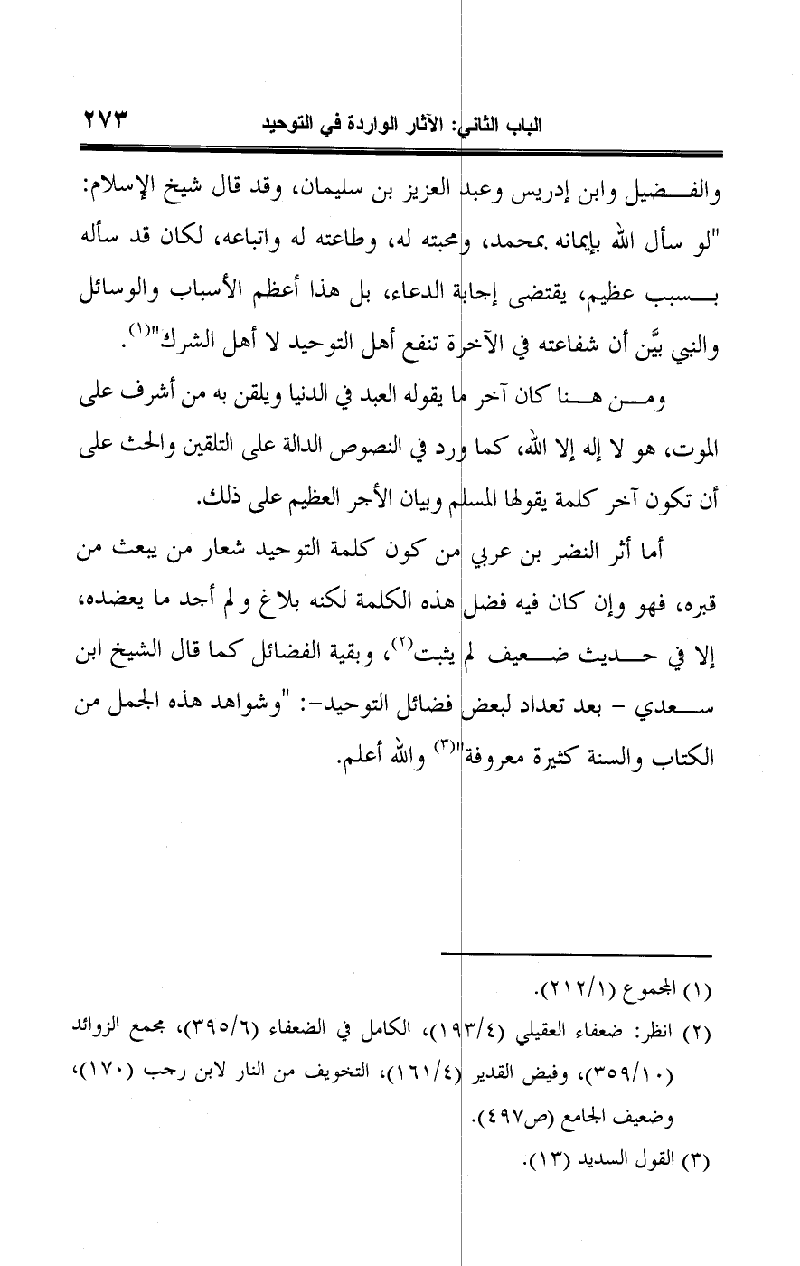 أما أثر النضر بن عربي من كون كلمة التوحيد شعار من يبعث من قبره، فهو وإن كان فيه فضل هذه الكلمة لكنه بلاغ ولم أجد ما يعضده، إلا في حديث ضعيف لم يثبت (¬٢)، وبقية الفضائل كما قال الشيخ ابن سعدي -بعد تعداد لبعض فضائل التوحيد-: "وشواهد هذه الجمل من الكتاب والسنة كثيرة معروفة" (¬٣) واللَّه أعلم.