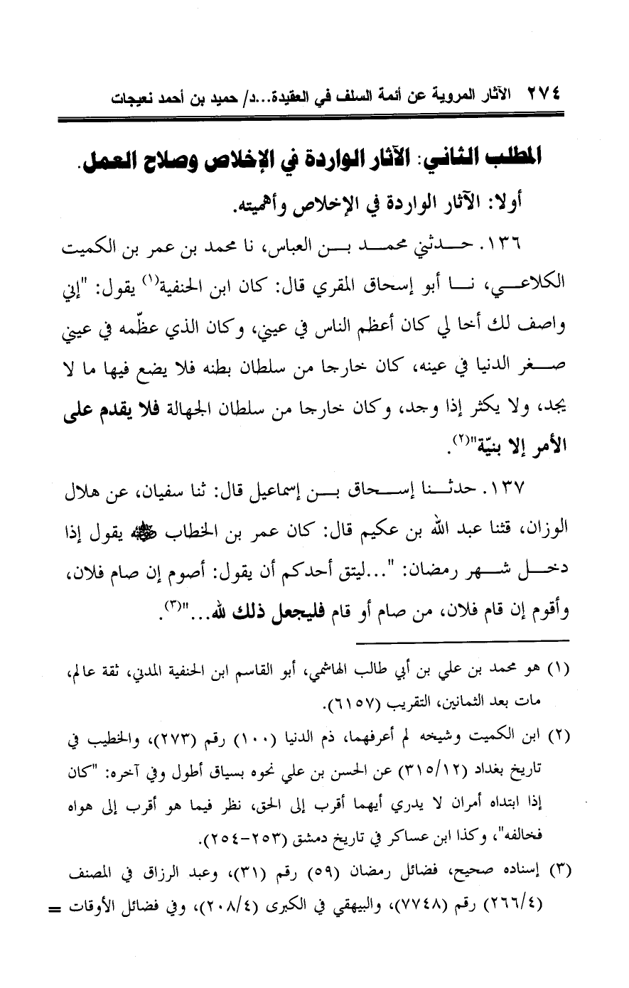 المطلب الثاني: الآثار الواردة في الإخلاص وصلاح العمل.