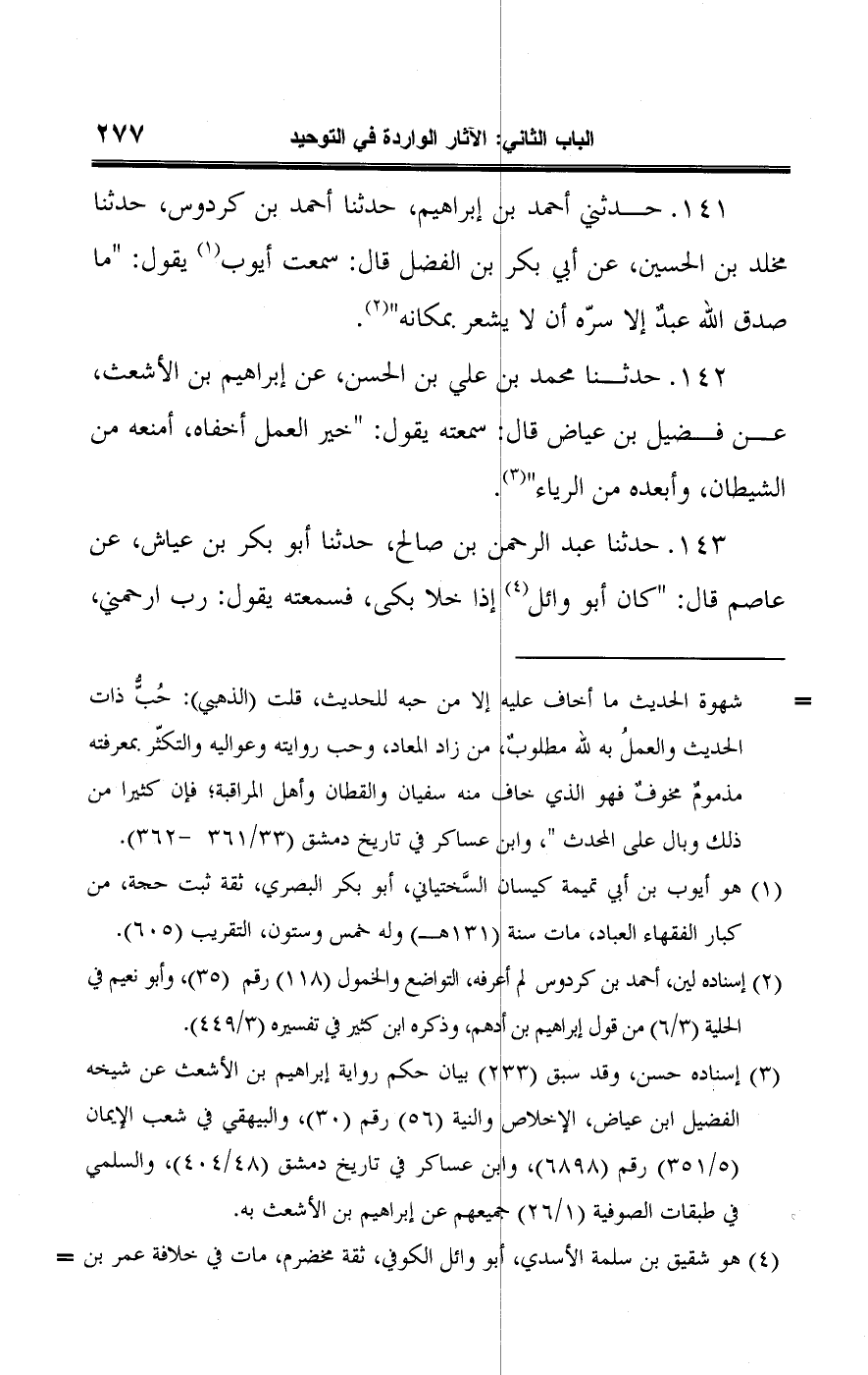 ١٤٢ - حدثنا محمد بن علي بن الحسن، عن إبراهيم بن الأشعث، عن فضيل بن عياض قال: سمعته يقول: "خير العمل أخفاه، أمنعه من الشيطان، وأبعده من الرياء" (¬٣).