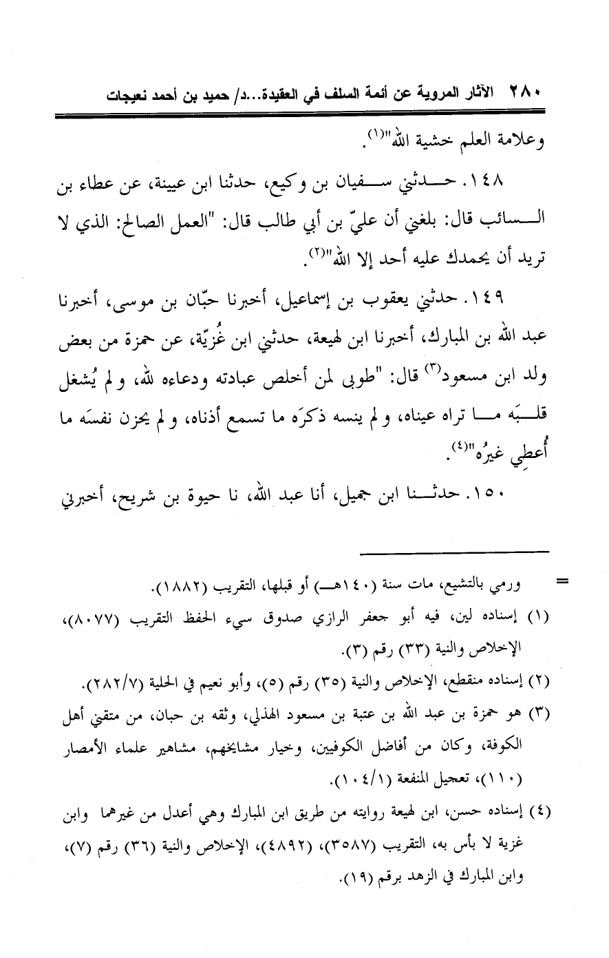 ١٤٨ - حدثني سفيان بن وكيع، حدثنا ابن عيينة، عن عطاء بن السائب قال: بلغني أن عليّ بن أبي طالب قال: "العمل الصالح: الذي لا تريد أن يحمدك عليه أحد إلا اللَّه" (¬٢).