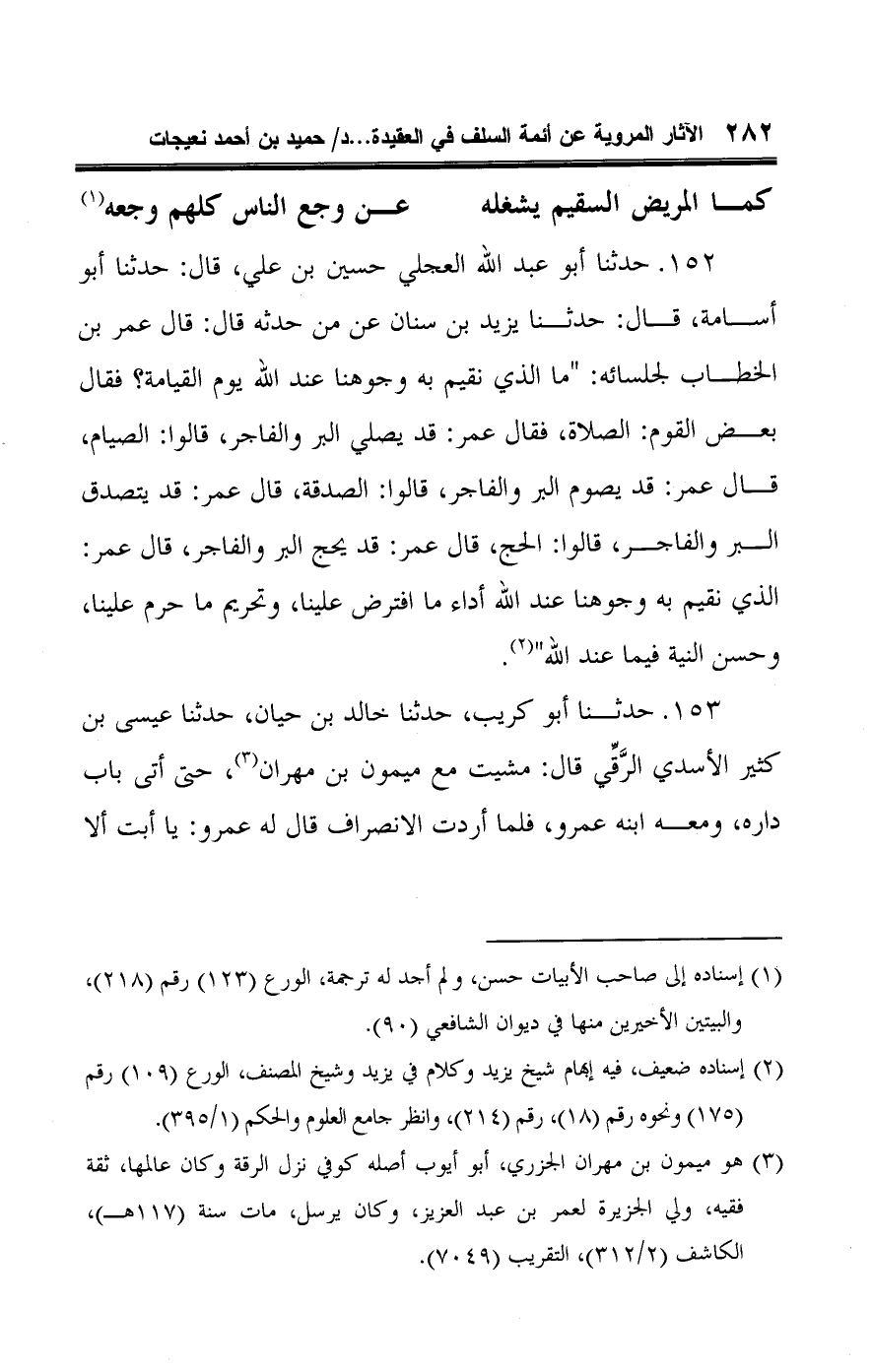 ١٥٢ - حدثنا أبو عبد اللَّه العجلي حسين بن علي، قال: حدثنا أبو أسامة، قال: حدثنا يزيد بن سنان عن من حدثه قال: قال عمر بن الخطاب لجلسائه: "ما الذي نقيم به وجوهنا عند اللَّه يوم القيامة؟ فقال بعض القوم: الصلاة، فقال عمر: قد يصلي البر والفاجر، قالوا: الصيام، قال عمر: قد يصوم البر والفاجر، قالوا: الصدقة، قال عمر: قد يتصدق البر والفاجر، قالوا: الحج، قال عمر: قد يحج البر والفاجر، قال عمر: الذي نقيم به وجوهنا عند اللَّه أداء ما افترض علينا، وتحريم ما حرم علينا، وحسن النية فيما عند اللَّه" (¬٢).