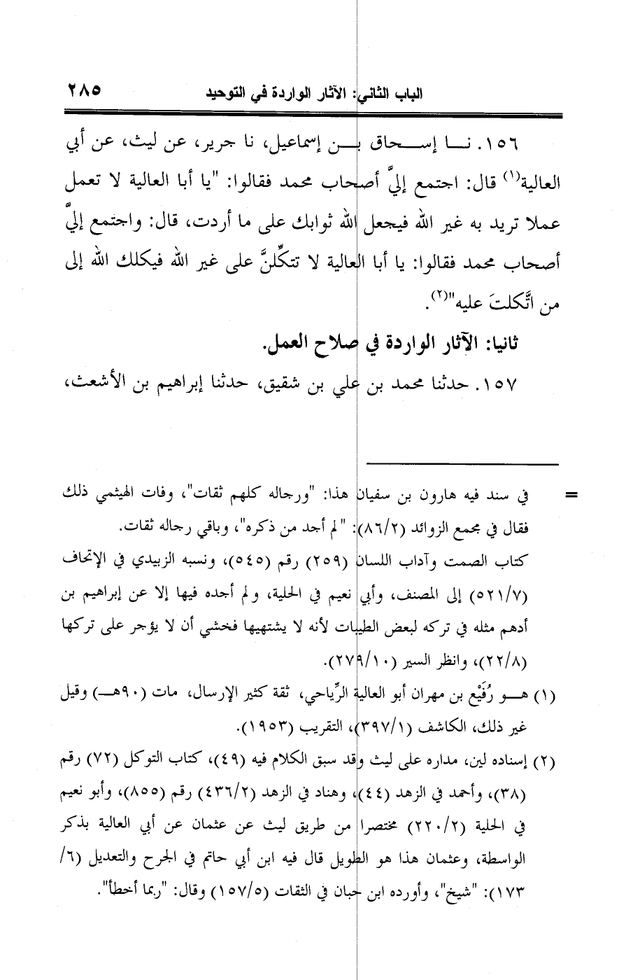 ١٥٦ - نا إسحاق بن إسماعيل، نا جرير، عن ليث، عن أبي العالية (¬١) قال: اجتمع إليّ أصحاب محمد فقالوا: "يا أبا العالية لا تعمل عملا تريد به غير اللَّه فيجعل اللَّه ثوابك على ما أردت، قال: واجتمع إلى أصحاب محمد فقالوا: يا أبا العالية لا تتكِّلنَّ على غير اللَّه فيكلك اللَّه إلى من اتَّكلتَ عليه" (¬٢).