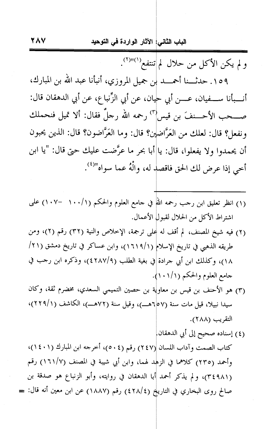 ١٥٩ - حدثنا أحمد بن جميل المروزي، أنبأنا عبد اللَّه بن المبارك، أنبأنا سفيان، عن أبي حيان، عن أبي الزِّنباع، عن أبي الدهقان قال: صحب الأحنفَ بن قيس (¬٣) رحمه اللَّه رجلٌ فقال: ألا تميل فنحملك ونفعل؟ قال: لعلك من العَرَّاضين؟ قال: وما العَرَّاضون؟ قال: الذين يحبون أن يحمدوا ولا يفعلوا، قال: يا أبا بحر ما عرَّضت عليك حتى قال: "يا ابن أخي إذا عرض لك الحق فاقصد له، والْهُ عما سواه" (¬٤).