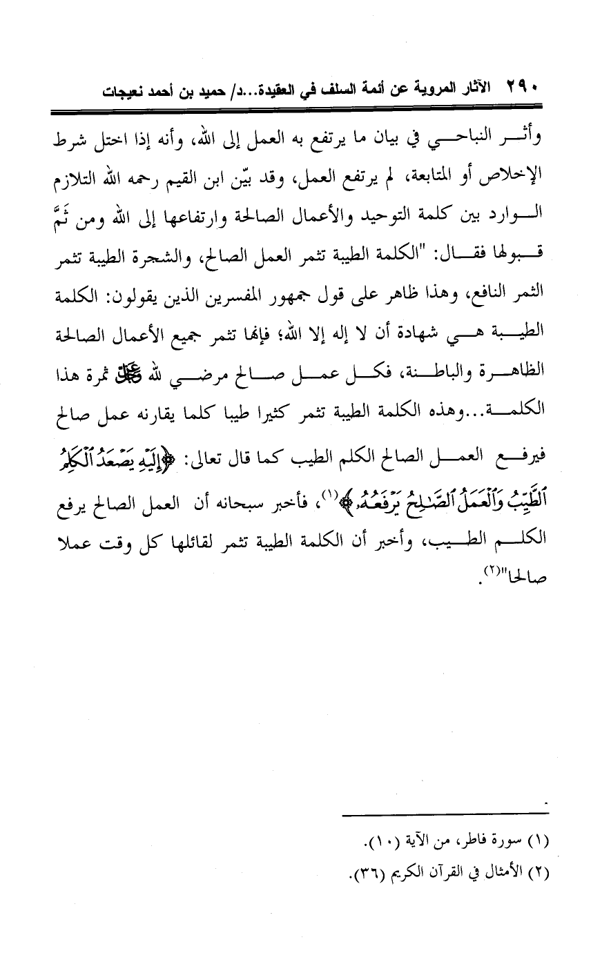 وأثر النباحي في بيان ما يرتفع به العمل إلى اللَّه، وأنه إذا اختل شرط الإخلاص أو المتابعة، لم يرتفع العمل، وقد بيّن ابن القيم رحمه اللَّه التلازم الوارد بين كلمة التوحيد والأعمال الصالحة وارتفاعها إلى اللَّه ومن ثَمَّ قبولها فقال: "الكلمة الطيبة تثمر العمل الصالح، والشجرة الطيبة تثمر الثمر النافع، وهذا ظاهر على قول جمهور المفسرين الذين يقولون: الكلمة الطيبة هي شهادة أن لا إله إلا اللَّه، فإنها تثمر جميع الأعمال الصالحة الظاهرة والباطنة، فكل عمل صالح مرضي للَّه -عزَّ وجلَّ- ثمرة هذا الكلمة. . . وهذه الكلمة الطيبة تثمر كثيرا طيبا كلما يقارنه عمل صالح فيرفع العمل الصالح الكلم الطيب كما قال تعالى: {إِلَيْهِ يَصْعَدُ الْكَلِمُ الطَّيِّبُ وَالْعَمَلُ الصَّالِحُ يَرْفَعُهُ} (¬١)، فأخبر سبحانه أن العمل الصالح يرفع الكلم الطيب، وأخبر أن الكلمة الطيبة تثمر لقائلها كل وقت عملا صالحا" (¬٢).