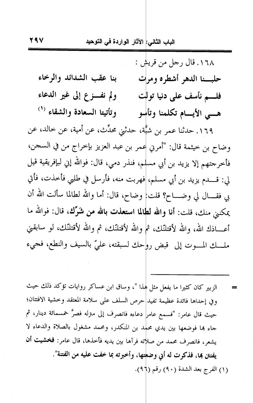 ١٦٩ - حدثنا عمر بن شبَّة، حدثني محدِّث، عن أمية، عن خالد، عن وضاح بن خيثمة قال: "أمرني عمر بن عبد العزيز بإخراج من في السجن، فأخرجتهم إلا يزيد بن أبي مسلم، فنذر دمي، قال: فواللَّه إني لبإفريقية قيل لي: قدم يزيد بن أبي مسلم، فهربت منه، فأرسل في طلبي فأخذت، فأتي بي فقال لي وضاح؟ قلت: وضاح، قال: أما واللَّه لطالما سألت اللَّه أن يمكنني منك، قلت: أنا واللَّه لطالما استعذت باللَّه من شَرِّك، قال: فواللَّه ما أعاذك اللَّه، واللَّه لأقتلنّك، ثم واللَّه لأقتلنّك، ثم واللَّه لأقتلنّك، لو سابقني ملك الموت إلى قبض روحك لسبقته، عليّ بالسيف والنطع، فجيء