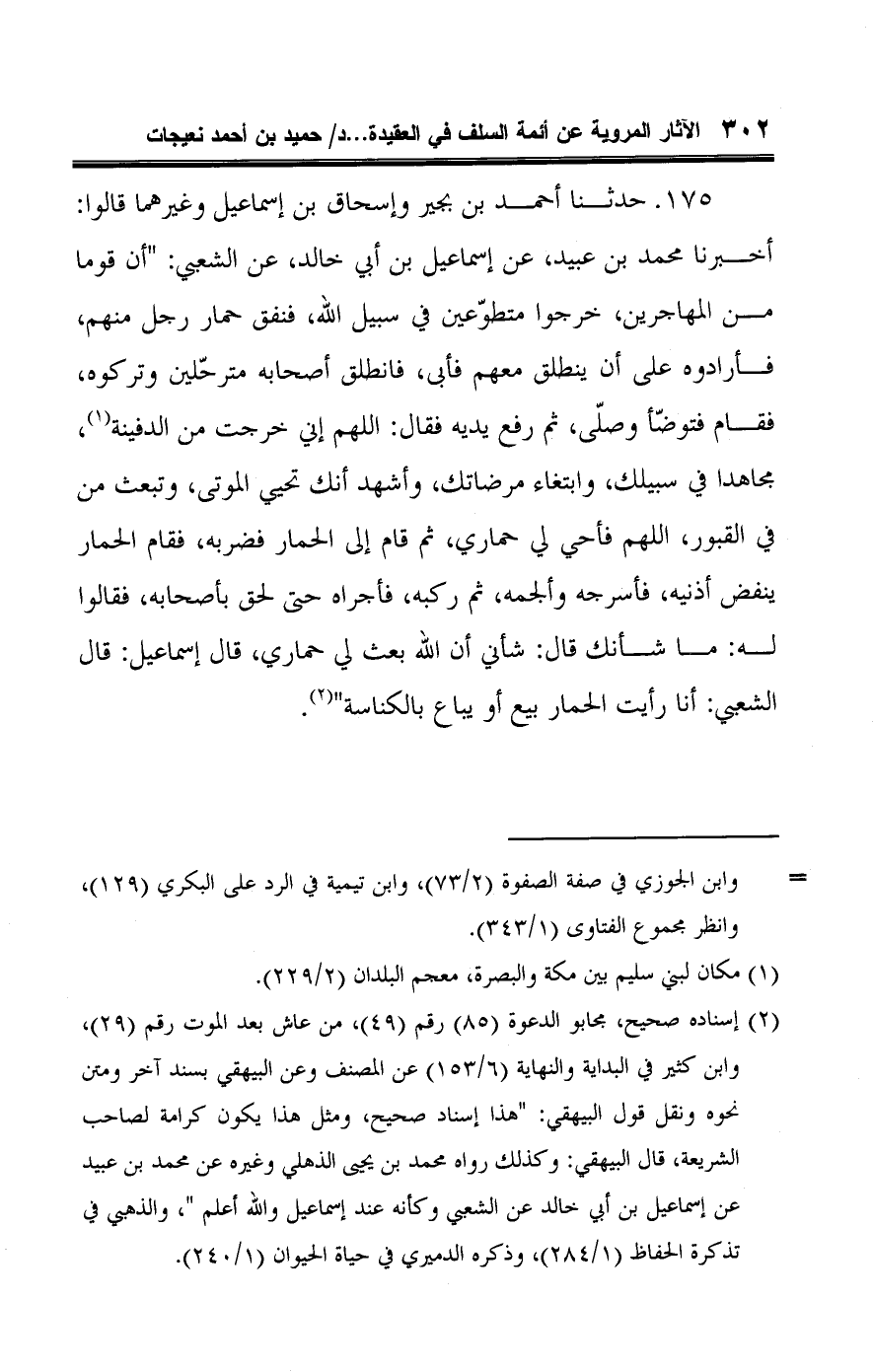 ١٧٥ - حدثنا أحمد بن بجير وإسحاق بن إسماعيل وغيرهما قالوا: أخبرنا محمد بن عبيد، عن إسماعيل بن أبي خالد، عن الشعبي: "أن قوما من المهاجرين، خرجوا متطوّعين في سبيل اللَّه، فنفق حمار رجل منهم، فأرادوه على أن ينطلق معهم فأبى، فانطلق أصحابه مترحّلين وتركوه، فقام فتوضّأ وصلّى، ثم رفع يديه فقال: اللهم إني خرجت من الدفينة (¬١)، مجاهدا في سبيلك، وابتغاء مرضاتك، وأشهد أنك تحيي الموتى، وتبعث من في القبور، اللهم فأحي لي حماري، ثم قام إلى الحمار فضربه، فقام الحمار ينفض أذنيه، فأسرجه وألجمه، ثم ركبه، فأجراه حتى لحق بأصحابه، فقالوا له: ما شأنك قال: شأني أن اللَّه بعث لي حماري، قال إسماعيل: قال الشعبي: أنا رأيت الحمار بيع أو يباع بالكناسة" (¬٢).