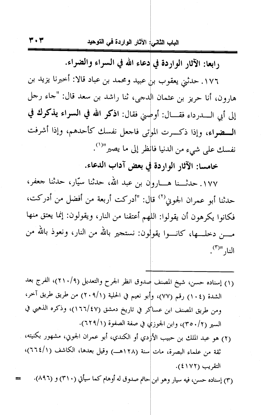 ١٧٧ - حدثنا هارون بن عبد اللَّه، حدثنا سيّار، حدثنا جعفر، حدثنا أبو عمران الجوني (¬٢) قال: "أدركت أربعة من أفضل من أدركت، فكانوا يكرهون أن يقولوا: اللهم أعتقنا من النار، ويقولون: إنما يعتق منها من دخلها، كانوا يقولون: نستجير باللَّه من النار، ونعوذ باللَّه من النار" (¬٣).