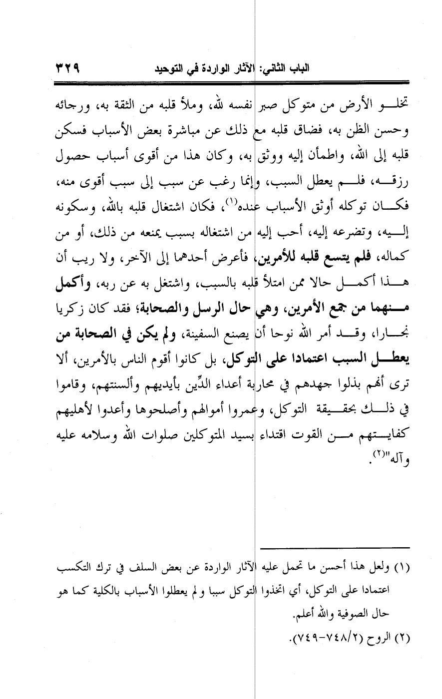 (¬١) ولعل هذا أحسن ما تحمل عليه الآثار الواردة عن بعض السلف في ترك التكسب اعتمادا على التوكل، أي اتخذوا التوكل سببا ولم يعطلوا الأسباب بالكلية كما هو حال الصوفية واللَّه أعلم.