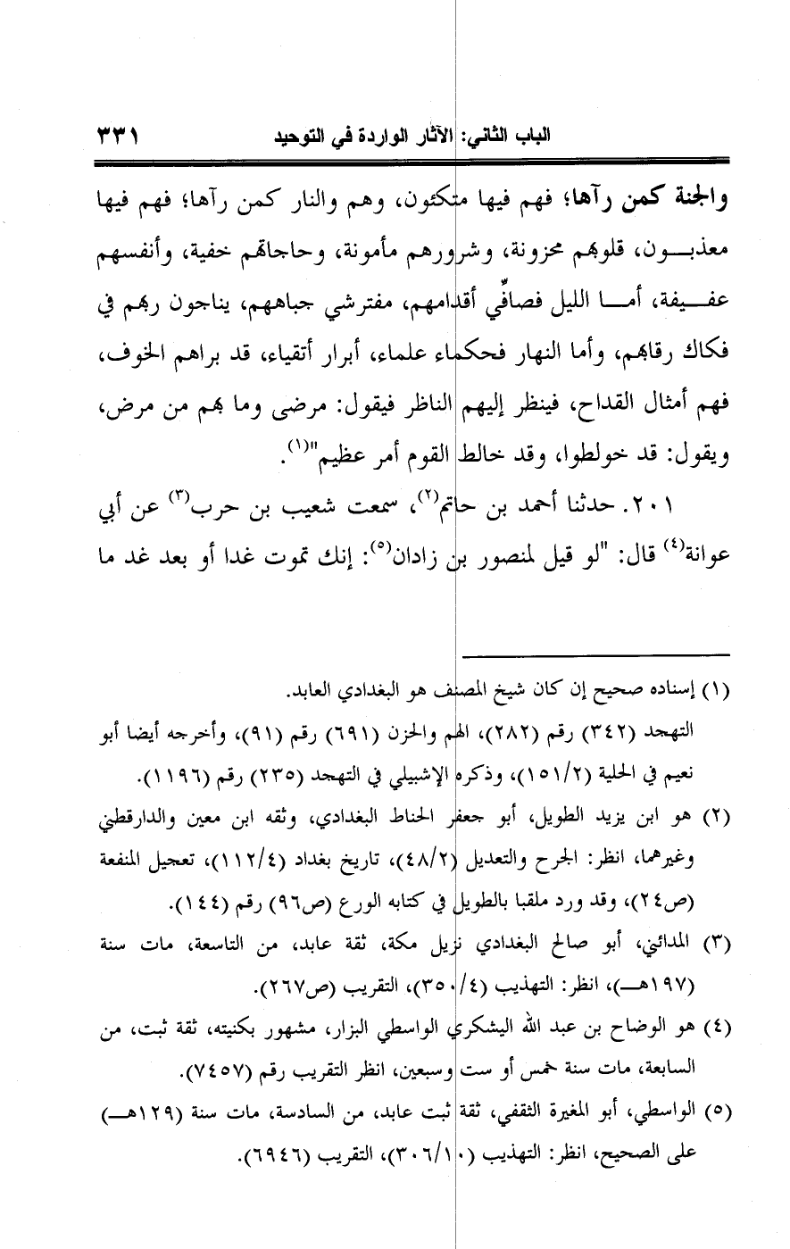 ٢٠١ - حدثنا أحمد بن حاتم (¬٢)، سمعت شعيب بن حرب (¬٣) عن أبي عوانة (¬٤) قال: "لو قيل لمنصور بن زادان (¬٥): إنك تموت غدا أو بعد غد ما