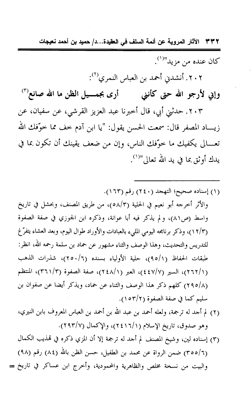 ٢٠٣ - حدثني أبي، قال أخبرنا عبد العزيز القرشي، عن سفيان، عن زياد المصفر قال: سمعت الحسن يقول: "يا ابن آدم خف مما خوّفك اللَّه تعالى يكفيك ما خوّفك الناس،