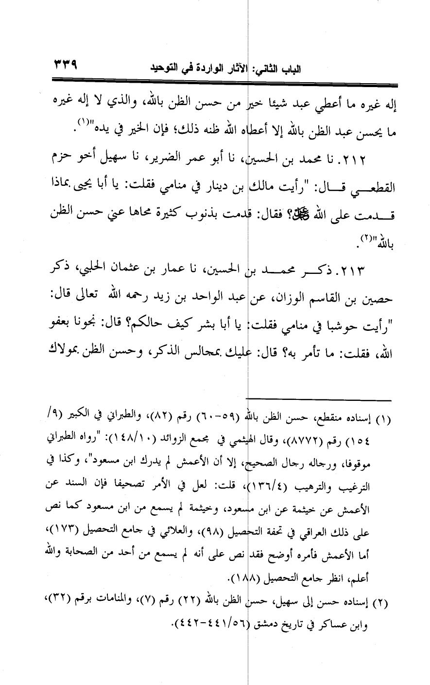(¬١) إسناده منقطع، حسن الظن باللَّه (٥٩ - ٦٠) رقم (٨٢)، والطبراني في الكبير (٩/ ١٥٤) رقم (٨٧٧٢)، وقال الهيثمي في مجمع الزوائد (١٠/ ١٤٨): "رواه الطبراني موقوفا، ورجاله رجال الصحيح، إلا أن الأعمش لم يدرك ابن مسعود"، وكذا في الترغيب والترهيب (٤/ ١٣٦)، قلت: لعل في الأمر تصحيفا فإن السند عن الأعمش عن خيثمة عن ابن مسعود، وخيثمة لم يسمع من ابن مسعود كما نص على ذلك العراقي في تحفة التحصيل (٩٨)، والعلائي في جامع التحصيل (١٧٣)، أما الأعمش فأمره أوضح فقد نص على أنه لم يسمع من أحد من الصحابة واللَّه أعلم، انظر جامع التحصيل (١١٨).