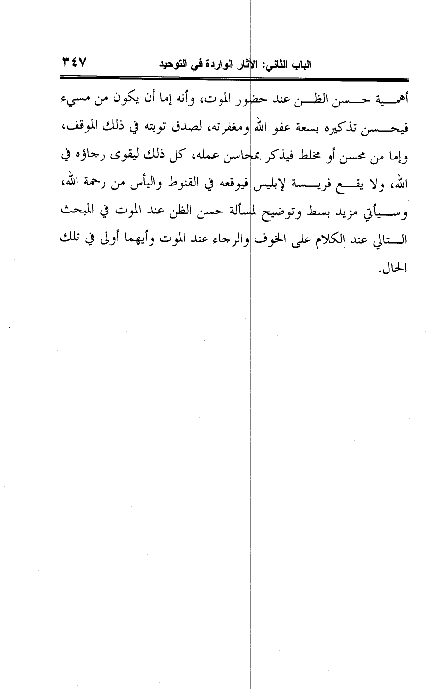 أهمية حسن الظن عند حضور الموت، وأنه إما أن يكون من مسيء فيحسن تذكيره بسعة عفو اللَّه ومغفرته، لصدق توبته في ذلك الوقف، وإما من محسن أو مخلط فيذكر بمحاسن عمله، كل ذلك ليقوى رجاؤه في اللَّه، ولا يقع فريسة لإبليس فيوقعه في القنوط واليأس من رحمة اللَّه، وسيأتي مزيد بسط وتوضيح للمسألة حسن الظن عند الموت في المبحث التالي عند الكلام على الخوف والرجاء عند الموت وأيهما أولى في تلك الحال.