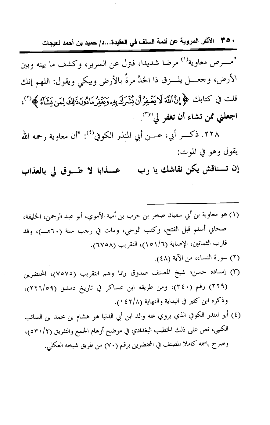 ٢٢٨ - ذكر أبي، عن أبي المنذر الكوفي (¬٤): "أن معاوية رحمه اللَّه يقول وهو في الموت: