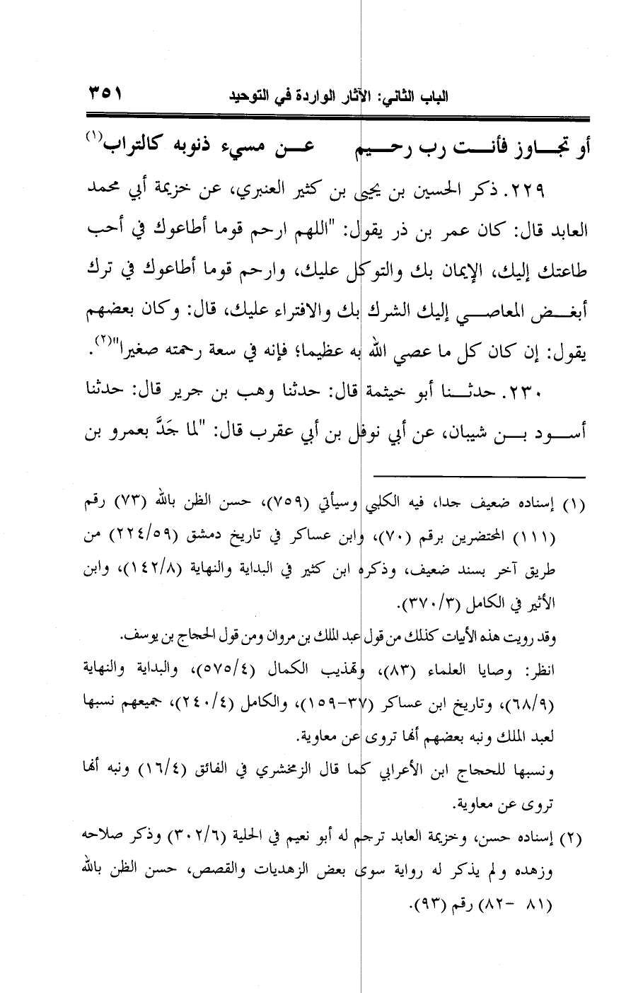 ٢٢٩ - ذكر الحسين بن يحيى بن كثير العنبري، عن خزيمة أبي محمد العابد قال: كان عمر بن ذر يقول: "اللهم ارحم قوما أطاعوك في أحب طاعتك إليك، الإيمان بك والتوكل عليك، وارحم قوما أطاعوك في ترك أبغض العاصى إليك الشرك بك والافتراء عليك، قال: وكان بعضهم يقول: إن كان كل ما عصي اللَّه به عظيما؛ فإنه في سعة رحمته صغيرا" (¬٢).