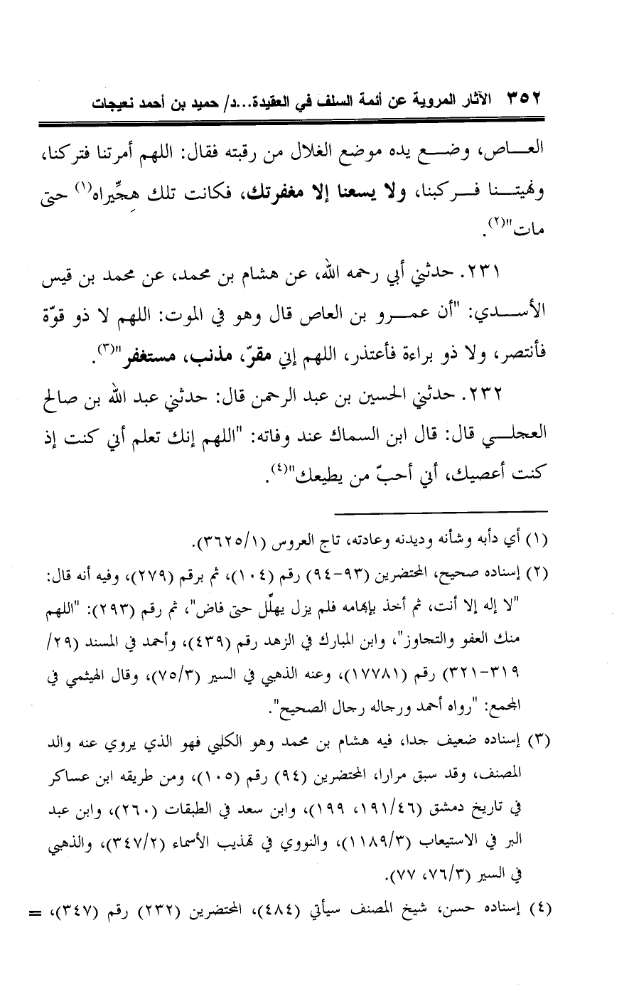 ٢٣١ - حدثني أبي رحمه اللَّه، عن هشام بن محمد، عن محمد بن قيس الأسدي: "أن عمرو بن العاص قال وهو في الموت: اللهم لا ذو قوّة فأنتصر، ولا ذو براءة فأعتذر، اللهم إني مقرّ، مذنب، مستغفر" (¬٣).