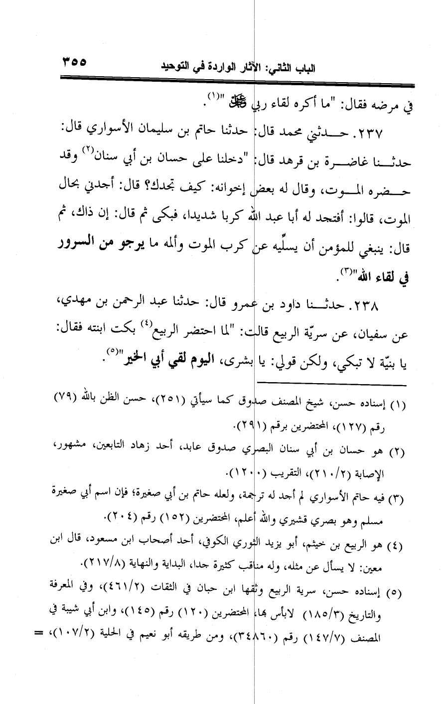 ٢٣٨ - حدثنا داود بن عمرو قال: حدثنا عبد الرحمن بن مهدي، عن سفيان، عن سريّة الربيع قالت: "لما احتضر الربيع (¬٤) بكت ابنته فقال: يا بنيّة لا تبكي، ولكن قولي: يا بشرى، اليوم لقي أبي الخير" (¬٥).