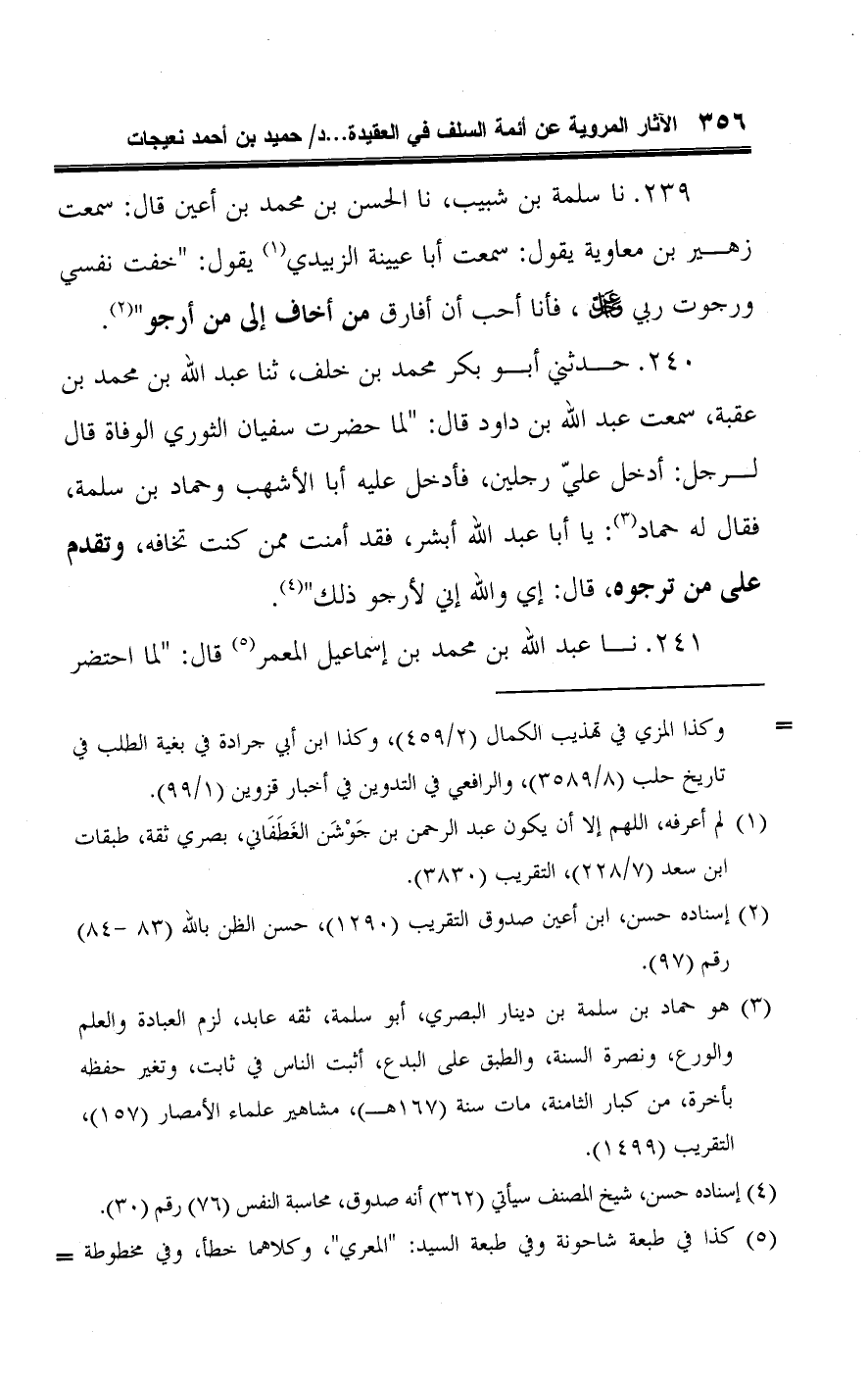 ٢٣٩ - نا سلمة بن شبيب، نا الحسن بن محمد بن أعين قال: سمعت زهير بن معاوية يقول: سمعت أبا عيينة الزبيدي (¬١) يقول: "خفت نفسي ورجوت ربي -عَزَّ وَجَلَّ-، فأنا أحب أن أفارق من أخاف إلى من أرجو" (¬٢).