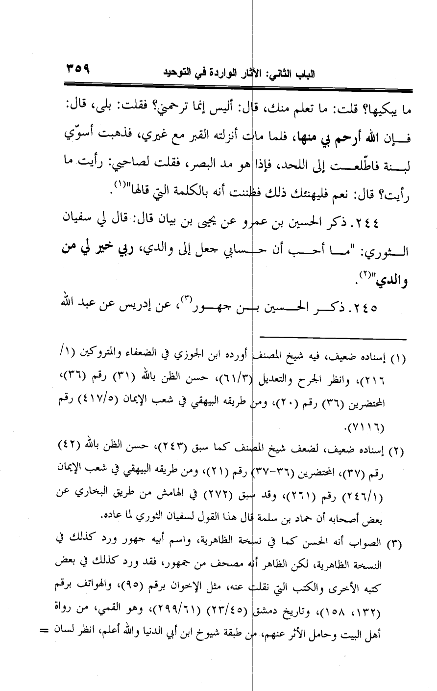 ٢٤٤ - ذكر الحسين بن عمرو عن يحيى بن بيان قال: قال لي سفيان الثوري: "ما أحب أن حسابي جعل إلى والدي، رب خير لي من والدي" (¬٢).