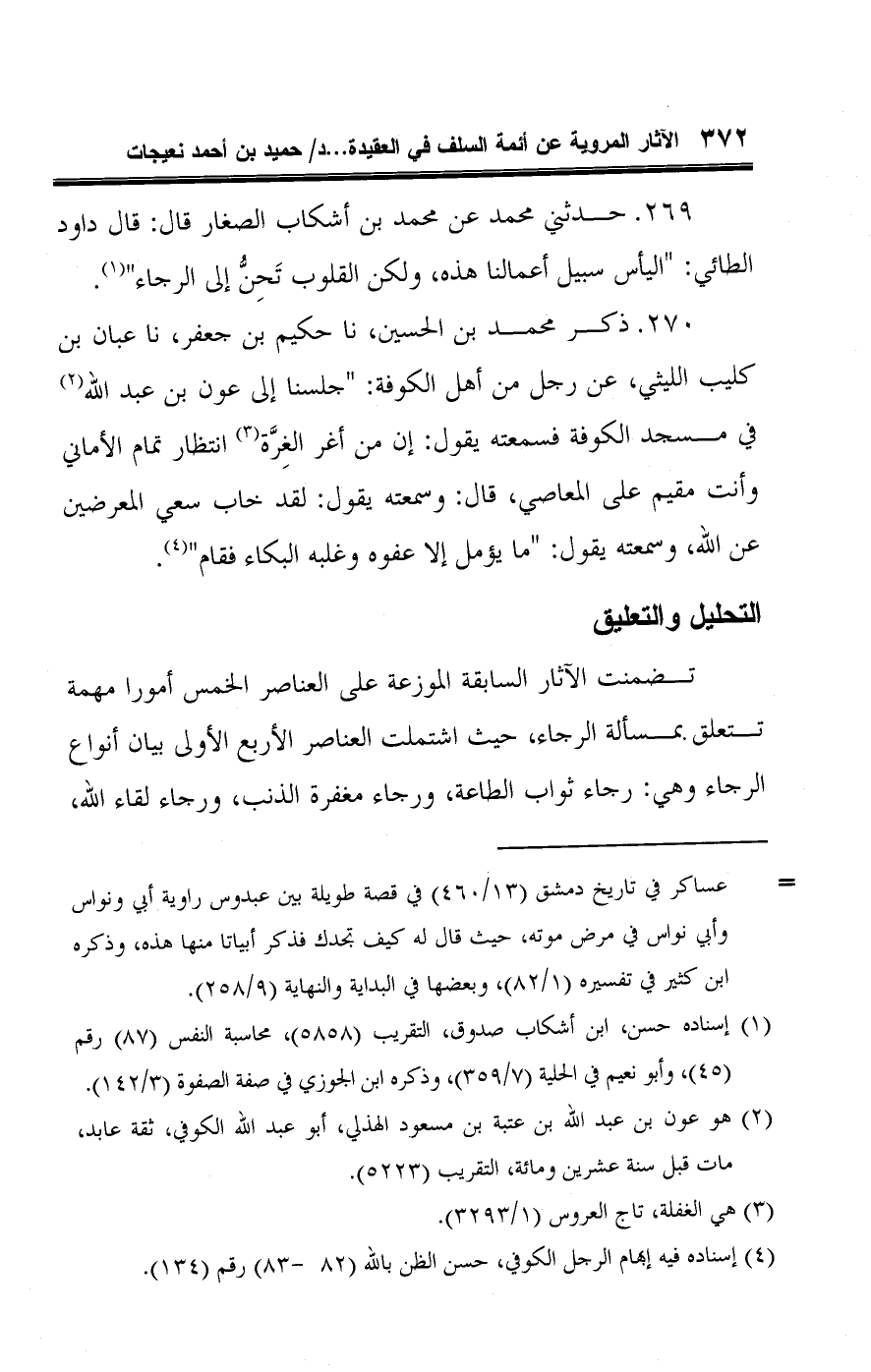 ٢٦٩ - حدثني محمد عن محمد بن أشكاب الصغار قال: قال داود الطائي: "اليأس سبيل أعمالنا هذه، ولكن القلوب تَحِنُّ إلى الرجاء" (¬١).